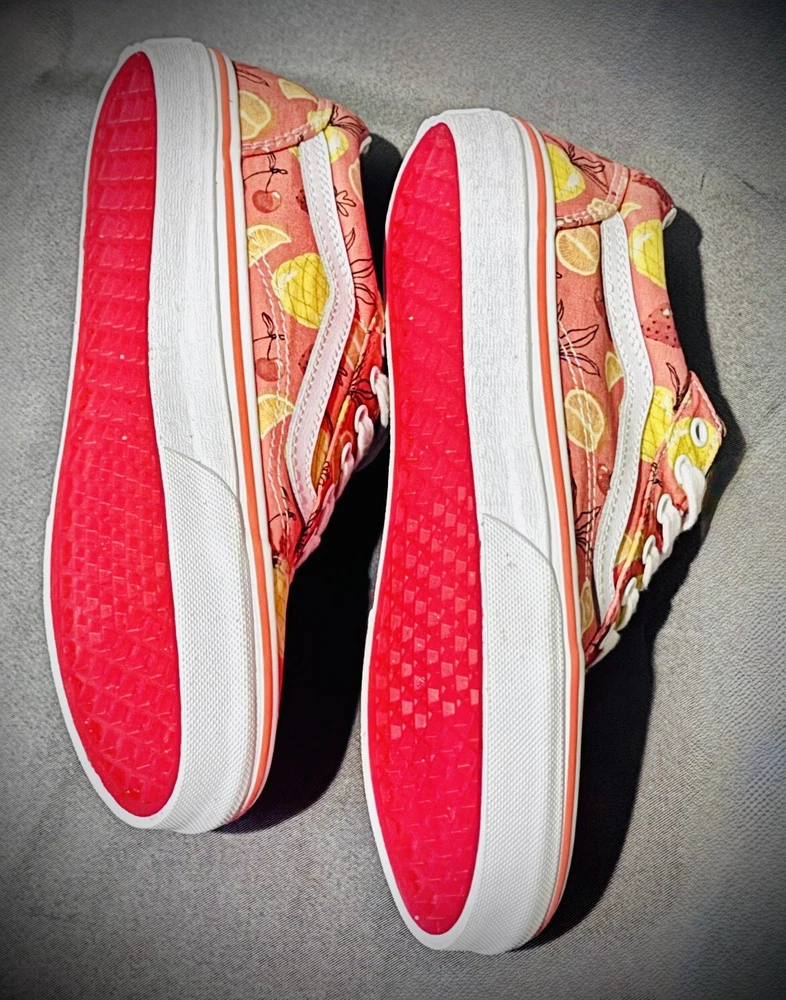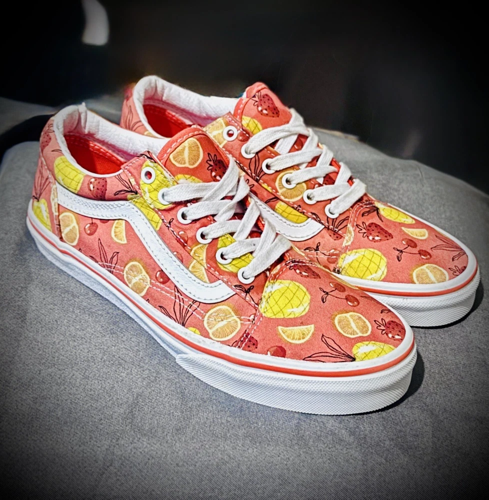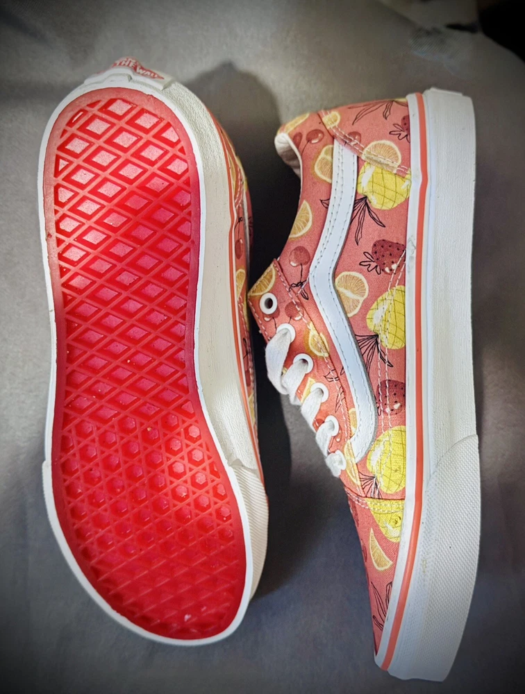 Elevate your little one's style with these Vans "Off The Wall" Juniors 5.5 Low Top Shoes. The colorful fruit all-over print, combined with the lace-up closure and round toe shape, make these shoes perfect for any occasion - from casual outings to formal events. The shoes come in a standard shoe width and are made of fabric both inside and out, ensuring comfort and durability. These shoes are perfect for unisex kids who love art, fun, and tropical themes. They are suitable for various activities such as walking, skateboarding, and even fishing. With a rubber outsole and fabric lining, these shoes are sure to keep your child's feet comfortable and secure. Get a pair of these Vans "Off The Wall" shoes today and let your child step out in style!