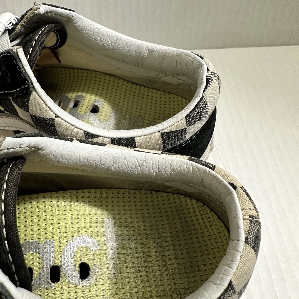 The Vans Off The Wall Checkerboard Skate Shoes are a stylish and functional choice for men. These athletic sneakers feature a black and white checkered pattern with a lace-up closure and suede upper material. The toe cap and outsole are also made of suede, adding durability and a sleek look to the design. With a size of 6.5, these Vans Checkerboard shoes are perfect for casual or activewear occasions, offering both comfort and street style for daily wear. Lace and insole are changed