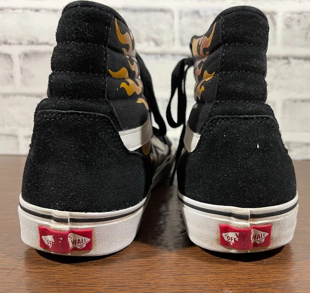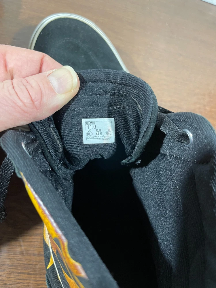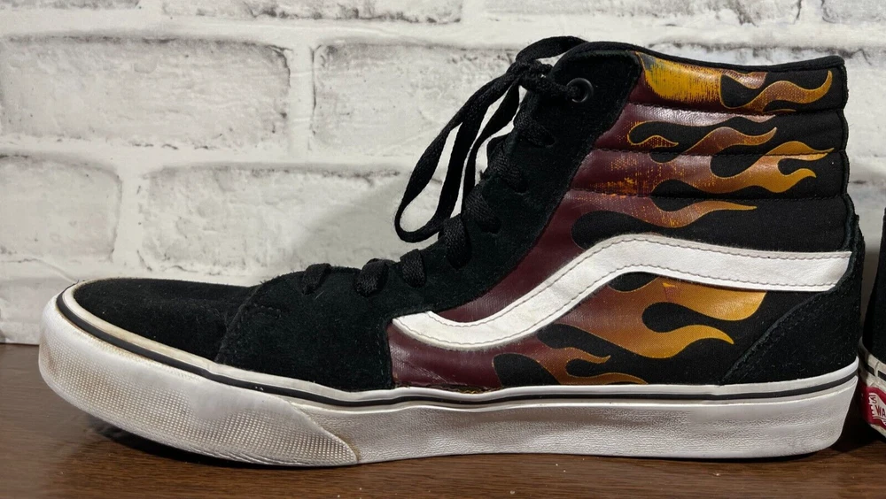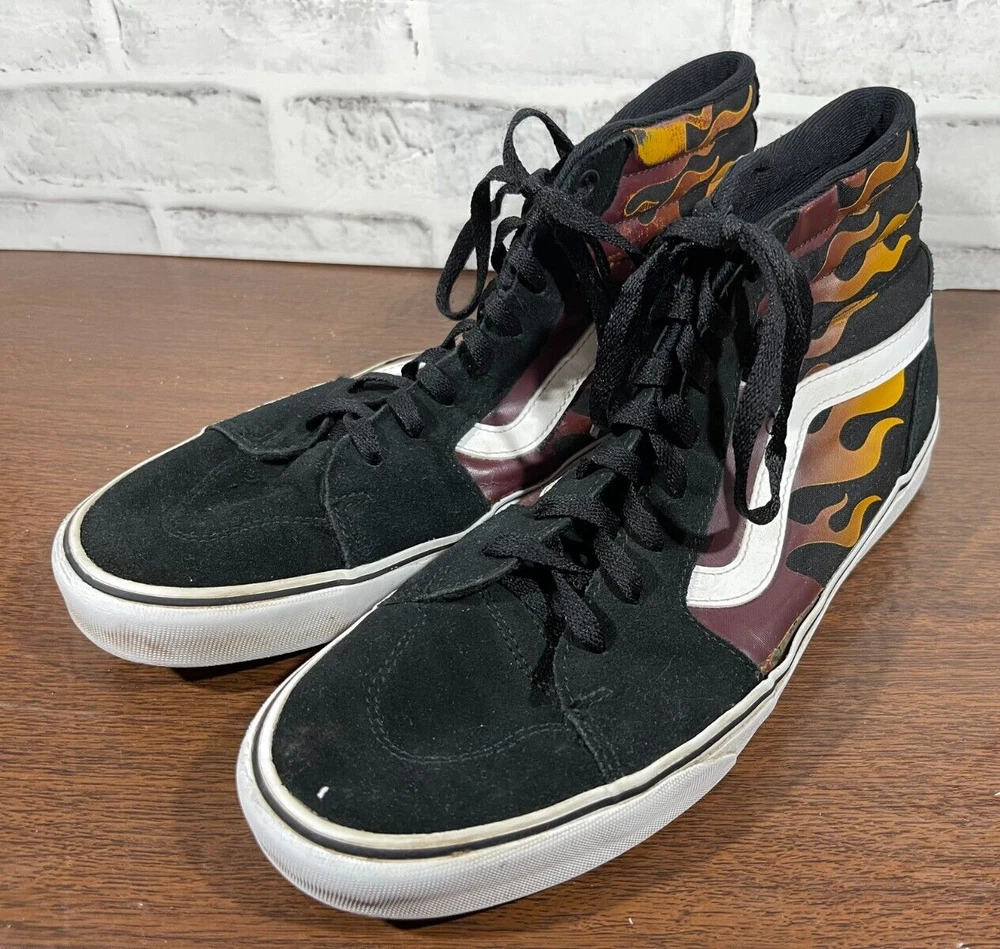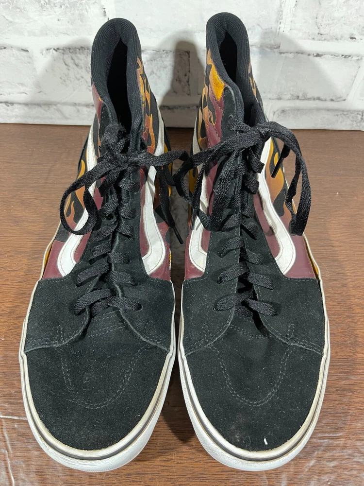 Vans Old School Sneakers in Men's size 11 feature a black suede upper with flame design, lace-up closure, high-top shaft style, rubber outsole, and cushioned, breathable comfort. The classic retro style is perfect for activewear, casual, or workwear use. Ideal for winter, summer, fall, or spring seasons, these VANS sneakers are a colorful addition to any wardrobe. Very good preowned condition with normal preowned wear and no issue. Please see all photos. For clothing specifically, see photos for all measurements and/or any issues if applicable. Pay close attention to the measurements as the size of the garment may quite possibly be different than the actual measurement(s) due to washing, shrinkage, or stretching as these are used clothes. The size in the title is the size on the tag of the garment. See photos for measurements of actual measurements as they may differ. ALWAYS CHECK THE MEASUREMENTS IN THE PHOTOS. This will remove any questions on measurements as well as always cover the possibility of human error in the listing(s) in the case of a typo or oversight. All clothing and shoes have been washed/cleaned, and comes from a smoke free environment. If shoe trees appear in the photos, they are for photography purposes only to illustrate how the shoes look filled out, and are not included. I am available for questions. I accept or negotiate reasonable offers. Have an amazing day. Thank you.