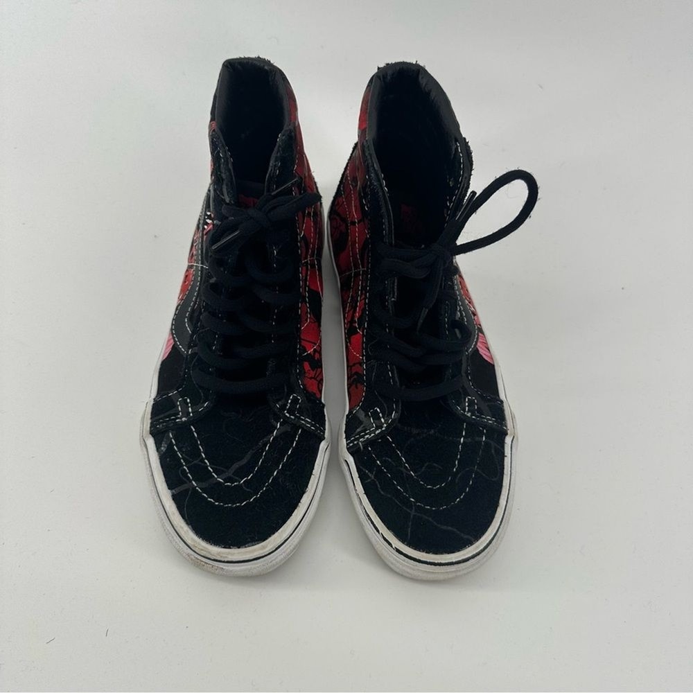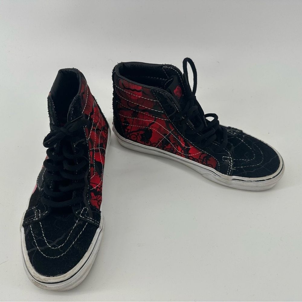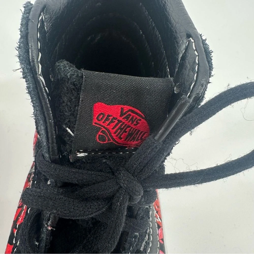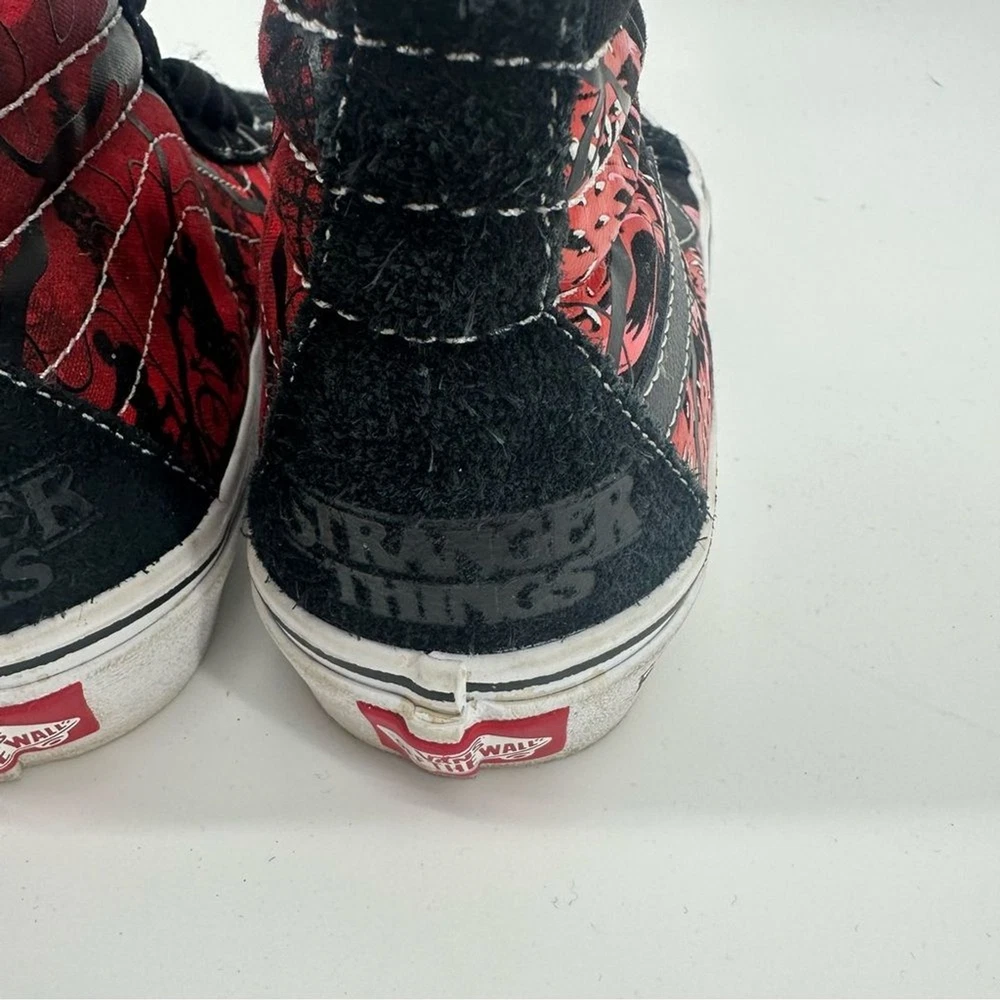 Vans Stranger Things × Sk8-Hi Reissue 'Upside Down' Unisex Shoes Perfect shoe for all stranger things fans. Womens size 6.5. Men’s size 5 Novelty print “friends don’t lie” Worn a few times, still in good Condition with a lot of life left in them Step into the Upside Down with these limited-edition Vans Sk8-Hi Reissue sneakers from the official Stranger Things Season 4 collection. Featuring a distressed black and red aesthetic with the iconic "Friends Don't Lie" quote on the sidewall and Demogorgon graphics, these high-tops are the ultimate footwear for any Hellfire Club member. Designed with a supportive padded collar and signature waffle outsole, they offer both Hawkins-approved style and everyday comfort. Pair these with ripped black denim and a vintage band tee for a rebellious 80s look, or style them with cargo joggers and a hoodie to channel your inner Max Mayfield Netflix Shop, 80s, Retro, fandom, casual