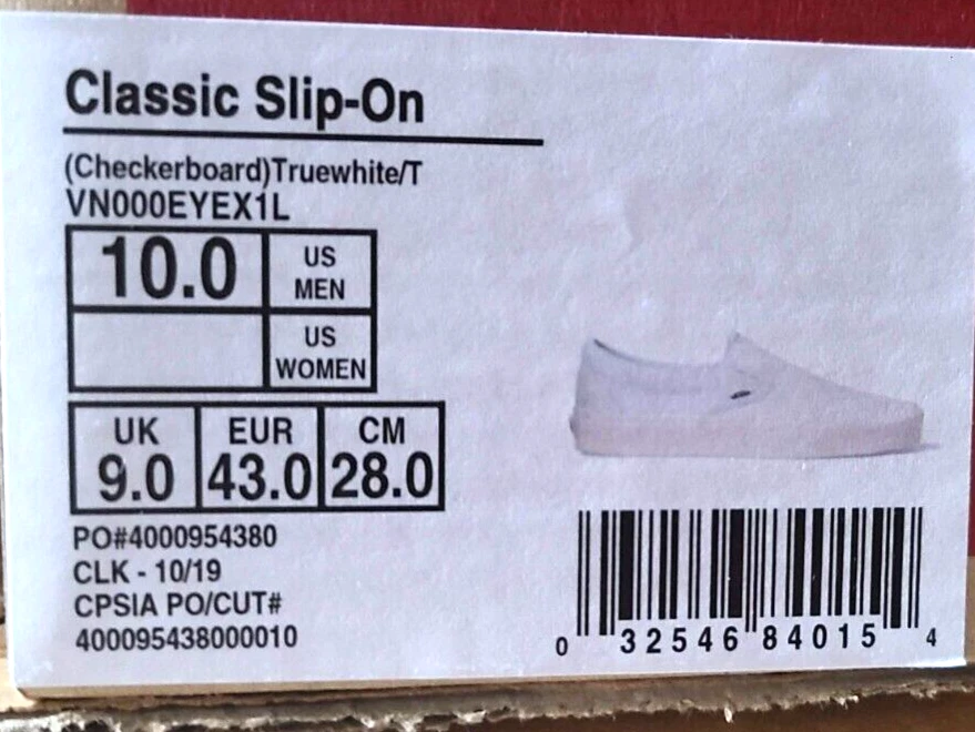 Item available today is the, Vans VN000EYE Classic Slip On White Checkered Shoes Men's SZ 10 . This is a new pair of shoes, ready to wear . Please see photos for more details. Items in photos are what come with the listing. Thank you for shopping small business. There are other sizes available in our store. Terms of Sale Listing is for item and/or accessories shown in photos only. Some states may require a tax be charged at the time of checkout, this is eBay automated. We ship and answer questions Mon-Fri 8am-4pm EST We stand behind our products and would be happy to assist you if you experience an issue. Please contact us first. We ship to your confirmed PayPal address only using UPS or USPS. Items over $200 may require signature upon delivery. There are no returns on items sold for parts. A RESTOCK FEE UP TO 20% MAY BE CHARGED FOR RETURNS THAT ARE NOT OF FAULT OF THE SELLER OR ITEMS NOT RETURNED IN THE SAME CONDITION. Thank you for shopping small business! Shipping Information Only ships within the Continental United States with one business day processing time. 11/19/2024 (, ADN) I-108 (B)