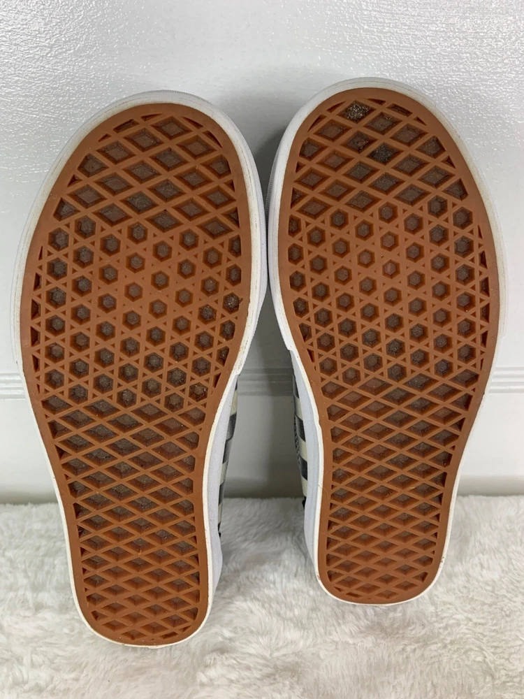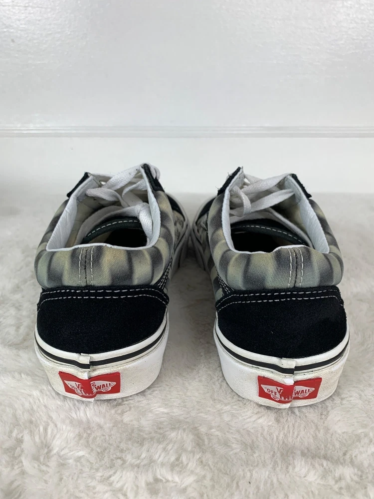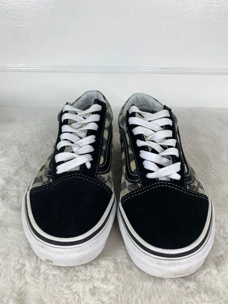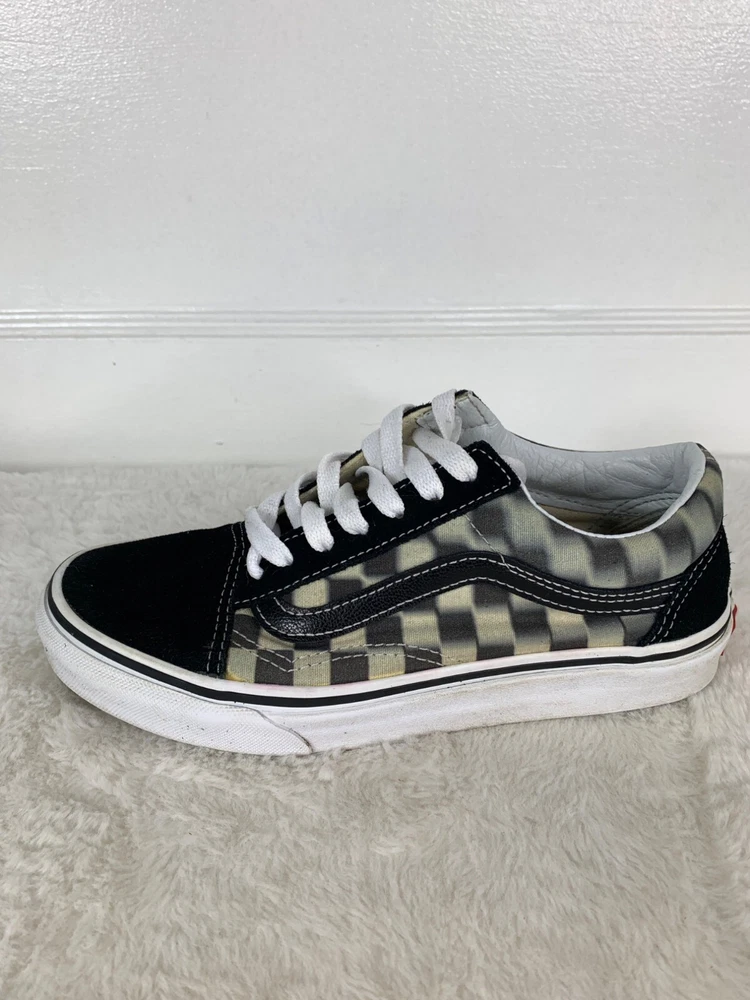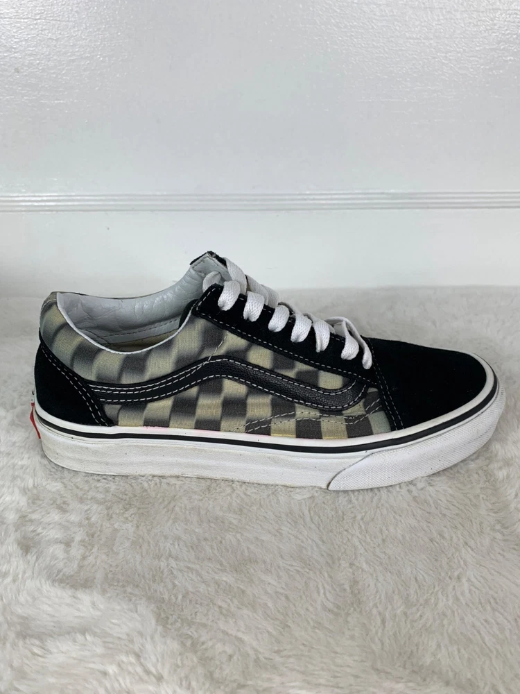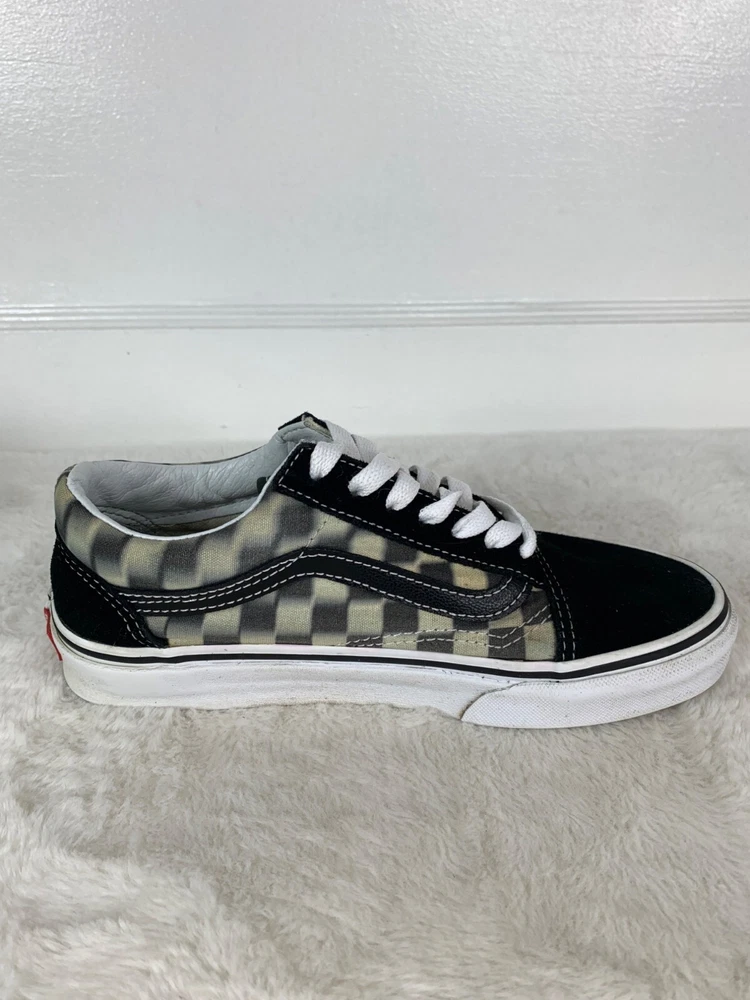 The Vans Women's Old Skool sneakers feature a striking checkerboard design paired with classic black accents. These sneakers are built for style and comfort, making them ideal for both casual outings and active days. The durable construction and timeless design ensure they remain a staple in any wardrobe. • Lace-up closure • Checkerboard pattern • Rubber sole • Padded collar • Canvas and suede materials Slight wear on soles, otherwise in good condition.