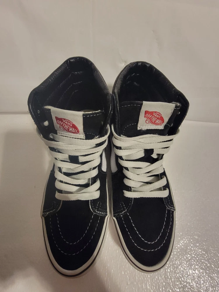 Up for sale is a pair of Vans SK8-Hi sneakers in black canvas material. These shoes are perfect for skateboarding and offer great comfort with their cushioned features. The high-top style provides ankle support and the colorful theme adds to their trendy look. These shoes are in great shape and ready for their new owner to enjoy. The UK shoe size is 4.5 and the US shoe size is 5.5, making them a perfect fit for both men and women with a shoe size of 7. The lining and upper material are both made of canvas and the shoes were manufactured in China. Don't miss out on the chance to own these Vans Sk8-Hi sneakers!