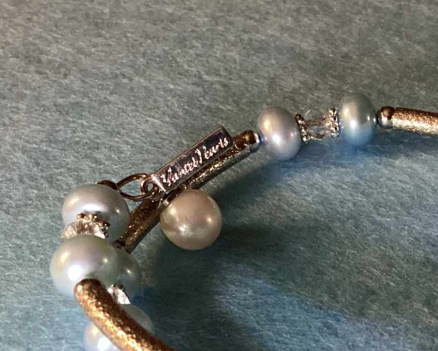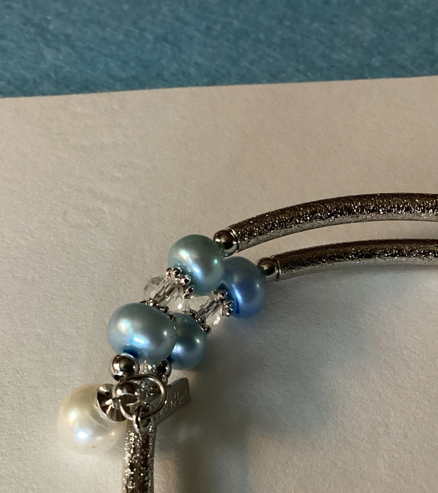 Add a touch of elegance to your outfit with this beautiful Vantel Pearls Baby Blue & Silver Wrap Bracelet. The bracelet features 15 pearls, 1 white and 14 light blue, faceted clear crystal beads between, and silver tone (probably sterling but not sure) beads/tubes. It is secured by a memory wire wrap and is stackable and adjustable. This bracelet is perfect for any occasion, whether it's a graduation, work or business wear, anniversary, everyday wear, or even a birthday. The charm type is a bead and the style is a wrap, with a wire chain type. The piece is signed by the brand Vantel Pearls. Get ready to embrace the beauty of nature and art with this charming bracelet. There are some darker blue spots on some of the pearls where the dye settled/pooled, but it’s so cute you’ll hardly notice that, it adds character and uniqueness. Comes as is, as pictured. Photos are part of the description. Visit our store for more great finds of all kinds.