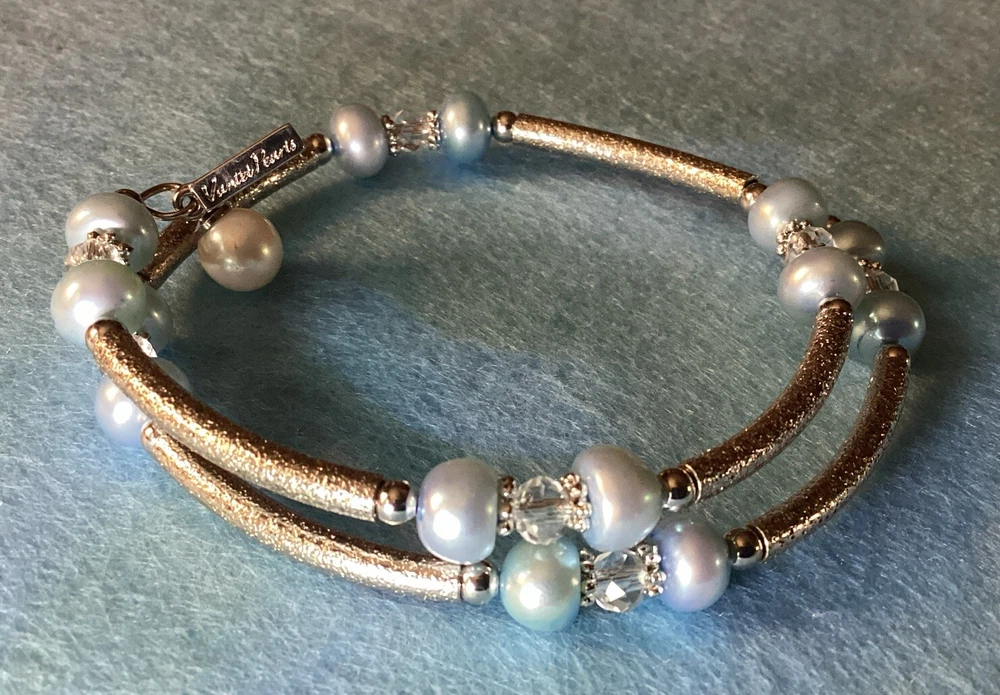 Number of Gemstones: 1 White + 14 Light Blue - 15 Pearls Base Metal: Unknown Seller Warranty: No Occasion: Any Occasion, Everyday, Work/Business Wear, Anniversary, Birthday, Graduation Brand: Vantel Pearls Wholesale: No Features: Adjustable, Stackable Secondary Stone: Pearl Color: Blue Type: Bracelet Country of Origin: United States Number of Diamonds: 0 Main Stone Color: Blue Chain Type: Wire Shape: Round Metal: Unknown Main Stone Creation: Unknown Signed: Yes Closure: No Closure, Memory Wire Wrap Main Stone Treatment: Dyed, Surface Coated, Unknown Charm Type: Bead Style: Wrap Main Stone: Pearl Metal Purity: Unknown Country/Region of Manufacture: Unknown Main Stone Shape: Round Theme: Art, Beauty, Beach, Nature