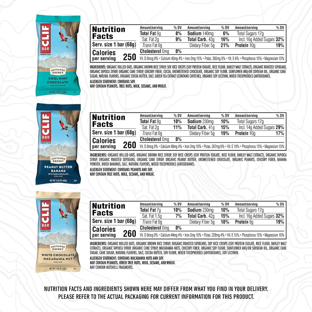 - Variety Pack - 6 Flavors - Made with Organic Oats - Energy Bars - Non-GMO - Plant Based Protein Bars (16 Pack) VARIETY PACK: Includes one 16-pack box of energy bars in a variety of delicious flavors including classic favorites like Chocolate Chip, Crunchy Peanut Butter, and White Chocolate Macadamia Nut Flavor! (packaging may vary) QUALITY INGREDIENTS: Non-GMO protein bars contain 9-11g of protein and are made with plant-based ingredients like organic rolled oats and no high fructose corn syrup - sustaining your energy never felt (or tasted) so good SUSTAINED ENERGY: is purposefully crafted with a mix of protein, fat, and carbohydrates to sustain active bodies before and during long, moderate-intensity activity CRAFTED WITH PURPOSE: energy bars are made in 2 LEED certified bakeries that use renewable electricity including on-site generation and/or the purchase of renewable energy credits (RECs) ON-THE-GO ENERGY: Whether you need sustained energy for hiking, climbing, or a long bike ride, delivers delicious energy that’s all wrapped up and ready to go Born on a 175-mile bike ride, energy bars are purposefully crafted with a mix of protein, fat, and carbohydrates to help sustain active bodies before and during long-lasting activity. energy bars are made with quality ingredients like wholesome organic rolled oats and no high-fructose corn syrup, and they are non-GMO and plant-based for a granola bar you can feel good about. As part of the CLIF brand mission, our 2 LEED certified bakeries and Emeryville, CA office run with the help of on-site solar arrays and/or offset electricity through the purchase of renewable energy credits (RECs). From Energy Bars to Builders Protein Bars and Zbar Snack Bars, our brands turn grabbing a bar into raising your bar. Shipping We offer FREE shipping on all orders! We ship within Three business days of payment, usually sooner. We use a selection of shipping services such as UPS, FedEx, USPS etc. We only ship to the lower 48 states, no APO/FPO addresses or PO Boxes allowed. Local pickups and combined shipping options are not provided at this time. Return You can return a product for up to 30 days from the date you purchased it. Any product you return must be in the same condition you received it and in the original packaging. Please keep the receipt. Payment We accept payment by any of the following methods: PayPal Please pay as soon as possible after winning an auction, as that will allow us to post your item to you sooner! Feedback Customer satisfaction is very important to us. If you have any problem with your order, please contact us and we will do our best to make you satisfied. Contact Us If you have any queries, please contact us via ebay. We usually respond within 24 hours on weekdays. Please visit our eBay store to check out other items for sale! Thank you for shopping at our store.