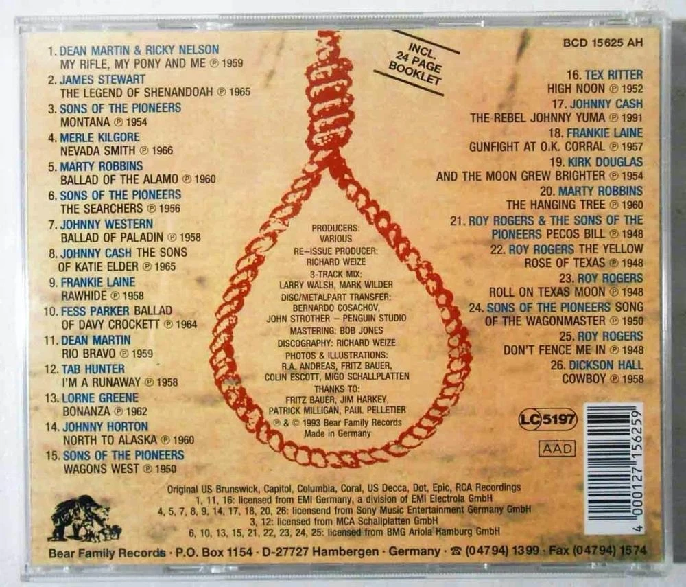 Music Movies / TV Video Games Books š§ Free UK Shipping š Same Day Dispatch 5ā Customer Service š· Great Value My rifle, my pony and me Ā£34.60 Ā£34.60 Ā£28.37 Save 18% Artist: Various Artists E A N: 4000127156259 Format: CD Genre: Pop Genre: Country Manufacturer: Bear Family-Rollercoaster Number Of Discs: 1 Release Date: 15/01/2000 Release Title: My Rifle, My Pony and Me Dean Martin & Ricky Nelson (2)ā My Rifle, My Pony And Me James Stewart (4)ā The Legend Of Shenandoah Sons Of The Pioneers*ā Montana Merle Kilgoreā Nevada Smith Marty Robbinsā The Ballad Of Alamo Sons Of The Pioneers*ā The Searchers Johnny Westernā Ballad Of Paladin Johnny Cashā The Sons Of Katie Elder Frankie Laineā Rawhide Fess Parkerā Ballad Of Davy Crockett Dean Martinā Rio Bravo Tab Hunterā I'm A Runaway Lorne Greeneā Bonanza Johnny Hortonā North To Alaska Sons Of The Pioneers*ā Wagons West Tex Ritterā High Noon Johnny Cashā The Rebel Johnny Yuma Frankie Laineā Gunfight At O.K. Corral Kirk Douglas (2)ā And The Moon Grew Brighter Marty Robbinsā The Hanging Tree Roy Rogers (3) & The Sons Of The Pioneersā Pecos Bill Roy Rogers (3)ā The Yellow Rose Of Texas Roy Rogers (3)ā Roll On Texas Moon Sons Of The Pioneers*ā Song Of The Wagonmaster Roy Rogers (3)ā Don't Fenice Me In Dickson Hallā Cowboy We also sell Films & TV Video Games Music Audio Books Editors picks Sit Down Next to Me Ā£9.84 Progress Ā£1.98 Scottish Moods Ā£19.11 Intensive Care Ā£1.98 Encore Ā£1.95 Friday's Child Ā£1.95 For The Many Ā£3.74 Keep On Ā£1.98 IMPORTANT INFORMATION IMAGES We use stock images in all of our listings. Images are for illustrative purposes only. Actual item cover, artwork and / or edition may vary. ITEM CONDITION If the item is listed as used, your item will be previously owned but still in great condition. The disc will play perfectly without interruption. Case, inlay notes and sleeve may show limited signs of wear or may not be included. If the item is listed as new, your item will come brand new and wrapped in original cellophane. REGION CODES All DVDs have embedded region codes, these codes are separated and administrated by geographic location (donāt forget to check our description before purchasing). Region 1: USA & Canada, Bermuda, and US Territories Region 2: Europe, UK Region 3: South-eastern Asia Region 4: Latin America and Australia Region 5: Russia, Asia (non-southeast), and Africa Region 6: China PACKAGING Your order might come packed in a recycled plastic mail bag. Used mail bags can be recycled via soft plastic recycling schemes operated by majority of supermarkets thourghout the UK. INTERNATIONAL ORDERS We would like to advise our international customers, that the UK is now out of the EU single market and that international orders may be subject to duty, VAT, administation or clearance fees imposed by the customs in destination country. MORE Please feel free to contact us for any additional information regarding the item. Powered by