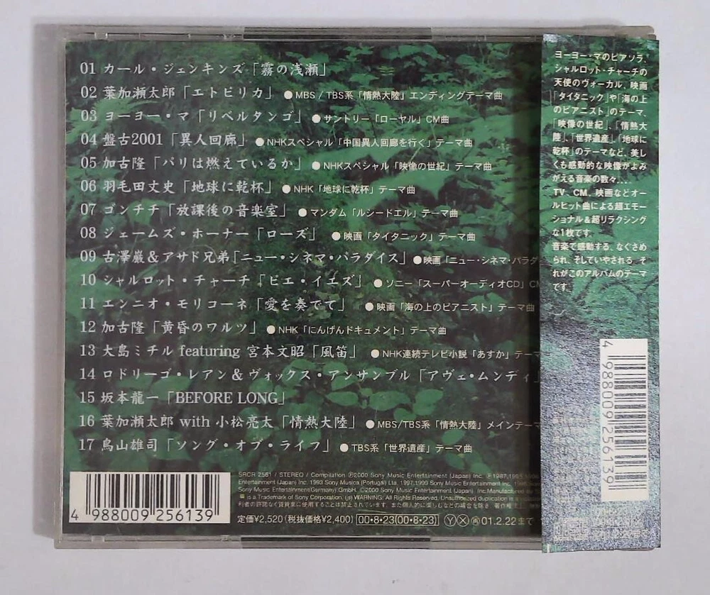 1 Karl Jenkins– 霧の浅瀬 3:09 2 Taro Hakase– エトピリカ 5:06 3 Yo-Yo Ma– リベルタンゴ 3:10 4 盤古2001– 異人回廊 3:26 5 TOK (3)– パリは燃えているか 5:02 6 Takefumi Haketa– 地球に乾杯 3:49 7 Gontiti– 放課後の音楽室 4:06 8 James Horner– ローズ 2:53 9 Furusawa Iwao* And Asado Brothers*– ニュー・シネマ・パラダイス 3:20 10 Charlotte Church– ピエ・イエズ 3:25 11 Ennio Morricone– 愛を奏でて 3:05 12 TOK (3)– 黄昏のワルツ 3:17 13 Michiru Oshima Featuring Fumiaki Miyamoto– 風笛 3:15 14 Rodrigo Leão & Vox Ensemble– アヴェ・ムンディ 4:32 15 Ryuichi Sakamoto– Before Long 1:21 16 Taro Hakase with Ryota Komatsu– 情熱大陸 5:00 17 Yuji Toriyama– ソング・オブ・ライフ 3:10