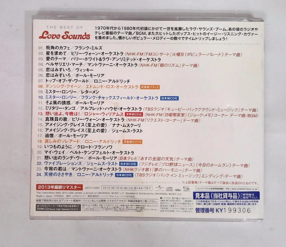 1 Frank Mills = フランク・ミルズ*– From A Sidewalk Cafe = 街角のカフェ 3:47 2 Billy Vaughn Orchestra* = ビリー・ヴォーン・オーケストラ*– Look For A Star = 星を求めて 2:13 3 Barry White And The Love Unlimited Orchestra = バリー・ホワイト* & ラヴ・アンリミテッド・オーケストラ*– Love's Theme = 愛のテーマ 4:11 4 Mantovani Orchestra* = マントヴァーニ・オーケストラ*– Bersaglieri March = ベルサリエリ・マーチ 2:45 5 Vicky* = ウィッキー*– L'amour Est Bleu = 恋はみずいろ 3:00 6 Paul Mauriat = ポール・モーリア*– L'amour Est Bleu = 恋はみずいろ 2:36 7 Ronnie Aldrich = ロニー・アルドリッチ*– Top Of The World = トップ・オブ・ザ・ワールド 3:03 8 Edmundo Ros Orchestra* = エドムンド・ロス楽団*– Dancing Queen = ダンシング・クイーン 2:36 9 Lettermen* = ザ・レターメン*– Mr. Lonely = ミスター・ロンリー 2:37 10 Frank Chacksfield Orchestra* = フランク・チャックスフィールド管弦楽団*– Mr. Lonely = ミスター・ロンリー 2:31 11 Paul Mauriat = ポール・モーリア*– Have You Never Been Mellow = そよ風の誘惑 3:14 12 Alfred Hause Orchestra* = アルフレッド・ハウゼ・オーケストラ*– Military Tango = ミリタリー・タンゴ 3:14 13 Roger Williams (2) = ロジャー・ウィリアムス*– Memories,Tonight! = 想い出よ、今晩は! 2:13 14 Billy Vaughn Orchestra* = ビリー・ヴォーン・オーケストラ*– Pearl Shell Song = 真珠貝の歌 2:20 15 Nana Mouskouri = ナナ・ムスクーリ*– Amazing Grace (Supreme Love) = アメイジング・グレイス(至上の愛) 4:28 16 James Last = ジェームス・ラスト*– Amazing Grace (Supreme Love) = アメイジング・グレイス(至上の愛) 3:14 17 Paul Mauriat = ポール・モーリア*– Recollection = 追憶 2:32 18 Ronnie Aldrich = ロニー・アルドリッチ*– Sorrowful Solaire = 哀しみのソレアード 3:31 19 Claude François = クロード・フランソワ*– As Usual = いつものように 4:12 20 Bert Kaempfert Orchestra* = ベルト・ケンプフェルト・オーケストラ*– My Way = マイ・ウェイ 3:59 21 Paul Mauriat = ポール・モーリア*– Memories Of Rendez-Vous = 想い出のランデ・ヴー 2:46 22 James Last = ジェームス・ラスト*– Vibrations = ヴァイブレーションズ 5:12 23 Mantovani Orchestra* = マントヴァーニ・オーケストラ*– The Way You Look Tonight = 今宵の君は 2:49 24 Ronnie Aldrich = ロニー・アルドリッチ*– Don't Sleep In The Angel = 天使のささやき 2:47
