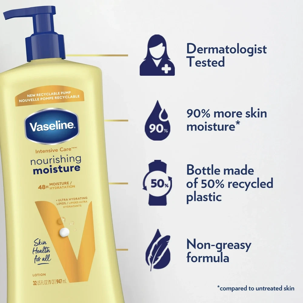 About this item Vaseline Intensive Care Nourishing Moisture Lotion, 32 oz FOR NOURISHED, HEALTHY SKIN: Vaseline Intensive Care Nourishing Moisture Lotion locks in moisture and deeply nourishes for healthy-looking skin. FORMULATED WITH ULTRA-HYDRATING LIPIDS: This body lotion for dry skin is formulated with Pure Oat Extract and Ultra-Hydrating Lipids that fortify the skin barrier and replenish moisture. FEEL THE DIFFERENCE: This body moisturizer is clinically tested to provide 90% more moisture (vs. untreated skin). NON-GREASY FEEL: This fast-acting lotion for dry skin absorbs quickly to leave your skin hydrated without feeling greasy. DAILY SKIN CARE: Use Vaseline Intensive Care Nourishing Moisture Body Lotion as your daily lotion for dry, rough skin. Apply to your skin for long-lasting hydration and noticeably healthier skin. EQUITABLE SKIN CARE FOR ALL: Skin health is essential for well-being. We’re helping those underserved get better care for their skin.