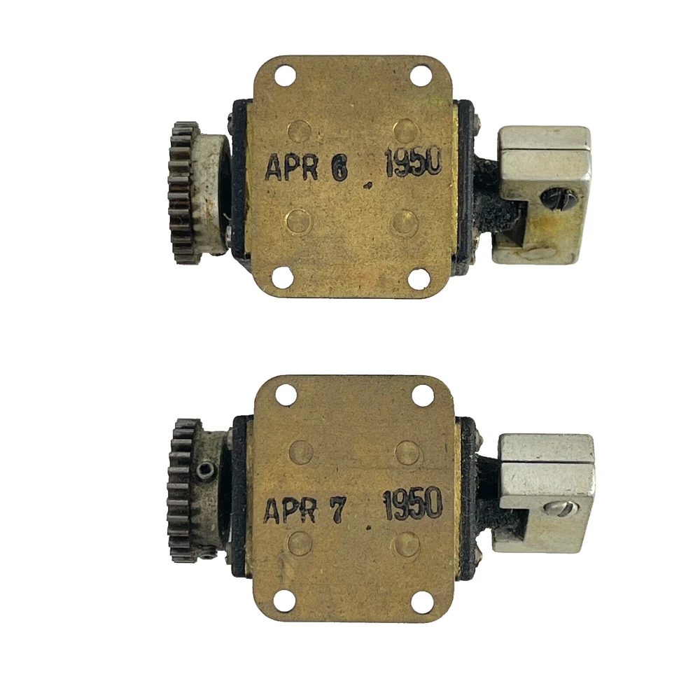 Veeder-Root Inc. -Two (2) Vintage Industrial Mechanical Tally Counters 5 digits VD logo on one side date of manufacture stamped on bottoms April 6 & 7, 1950 no model number indicated heavy & solid; each weighs 6 oz also great for steam punk decor good vintage condition with minor cosmetic distress from age