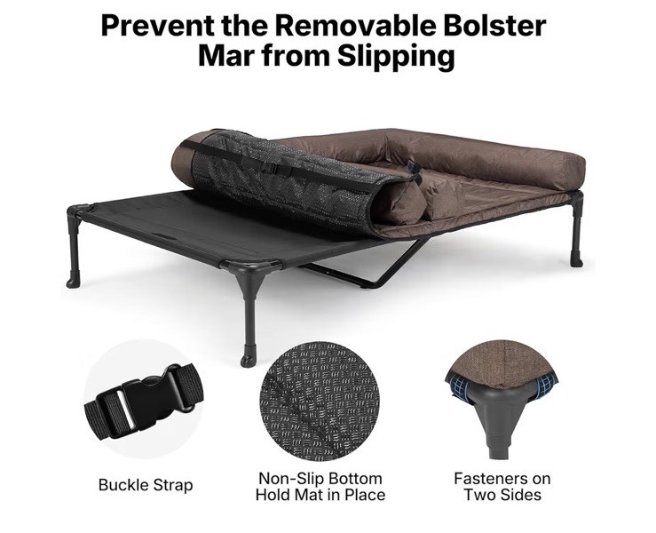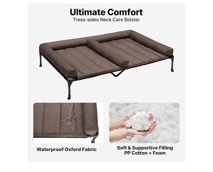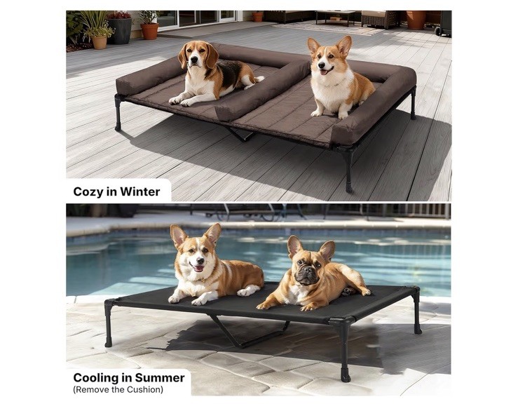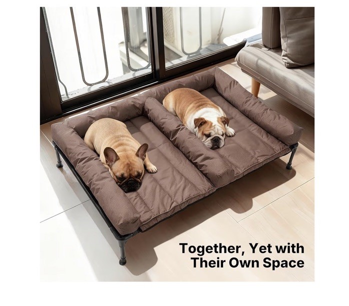 Open box New item! Double Dog Bed: Measuring 49" x 33" x 9", with each individual slot at 18.5" x 29", comfortably accommodates two medium-sized pets. It allows your pets to be together while enjoying their own space, while looks neater than 2 separate beds. Perfect for family with multiple dogs or cats Double Comfort Dog Cot: The bolster mat provides a cozy and comfortable place for your furry friends to rest, and the raised sides offer a sense of security and support. With soft PP cotton filling and cooling touch surface, the dog beds are sure to please even the pickiest of pets Cooling Elevated Dog Bed: The raised pet bed enables your pets get rid of wet hard dirty floor and helps their joint relieved. And the breathable Teslin mesh allows cooling breeze flow through the bed to make pets refreshing in sultry summer Robust and Stable: Our raised dog bed is composed of thick Powder-Coated steel, durable Teslin mesh, and the non-slip feet, with a high load capacity; Moreover, the removable bolster mat is waterproof & anti-scratch, and a non-slip bottom and velcros can fasten it in place User-Friendly: Our bolster dog bed is easy to install with the snap-on design, no tools needed; Lightweight and portable, perfect for indoor or outdoor use; Cleaning is a breeze, just wipe it down simply for daily upkeep or hose it off