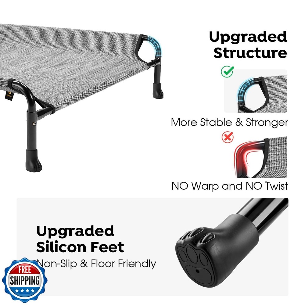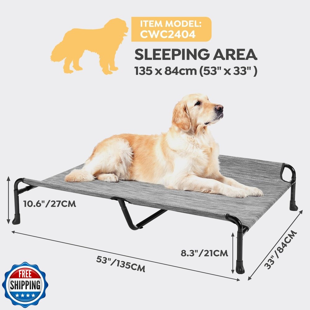 Veehoo Cooling Elevated Dog Bed - Raised for Large Dogs, Outdoor With Guardrail, Upgraded Non-Slip Feet, Breathable Teslin Mesh, Portable Camping Cot, 53 x 33 Inches, Black Silver Features Extra Large Dog Bed: The dog bed frame measures 53.0"L x 33.0"W x 10.6"H (including 2.4" guardrail height), supports up to 120 lbs(68kg). Ideal for Golden Retriever, Labrador, Rottweilers, Boxers, Huskies, Border Collie, Samoyed, Wolf dog etc. Dog Bed with Guardrail: The double-sided guardrail prevents your dog from accidentally rolling off the bed, giving your pet a safe and snuggle around feeling; And the slope headrest provides comfort neck support. Enhanced Stability: Upgraded non-slip feet with soft silicon bottom guarantee the dog cot bed doesn’t slide on the floor when dog runs and jumps on it; And upgraded bed frame constructure ensure no twist and no sudden collapse; Cooling Elevated Dog Bed: Crafted of durable Teslin mesh in the center, the bed allows airflow and water penetrate, keeping your pet cooling and dry in the humid summer; and the raised design makes your pet off hard muddy ground, keeping clean and joints health; On-the-Go Dog Bed: Hassle-free setup, no tool needed; washable dog bed is easy to maintain clean, simply wipes clean or hose off, no longer worry about your pup’s dirty paws and dog smell. This portable dog bed is ideal for both indoor comfort and outdoor adventures. Shipping Free & Fast Shipping: We offer free shipping to most of the USA with a normal delivery time of 3-7 days. However, due to the current situation, additional delivery time (up to 3 weeks) may be required for some items. Alternative Carriers: We may use alternative carriers (e.g., USPS, FedEx, UPS) to ensure your package arrives safely and on time. Due to the use of multiple carriers, we are unable to provide a tracking number automatically. Handling Time: Orders are processed and shipped within 1-2 business days of receiving cleared payment. Shipping Restrictions: Shipping to Alaska, Hawaii, Puerto Rico, Guam, and other US territories may incur shipping charges or delivery restrictions. Please contact us before ordering, or your order can be refunded/cancelled. State Restrictions: Certain items may not be shipped to California due to state regulations. Contact for Tracking Updates: If you require tracking updates or have any concerns about the delivery of your order, please feel free to contact us, and we will be happy to assist you. Return Policy 30-Day Hassle-Free Returns: If you are not completely satisfied with your purchase, you can return the item for free within 30 days of receiving it for a full refund or exchange. Easy Return Process: Contact us, and we will provide you with a prepaid return shipping label and detailed instructions. No Restocking Fee: There are no restocking fees for returns. However, the buyer is responsible for return shipping costs if the return is not due to a seller"s error. Refund Processing: Refunds will be processed within 1 business day of receiving the returned item in its original condition. Feedback Your feedback is extremely important to us. We strive to provide the best products and customer service possible. If you are satisfied with your purchase, please take a moment to leave us a positive review. If you have any concerns or issues with your order, please contact us before leaving negative feedback. We are committed to resolving any problems and ensuring your satisfaction. Contact Us If you have any questions or concerns, please feel free to reach out to our customer support team. You can contact us through the eBay messaging system. We are available Monday to Friday, 9:00 am to 5:00 pm EST, and we will do our best to respond to your inquiry within 24 hours. Thank you for supporting our small family business!