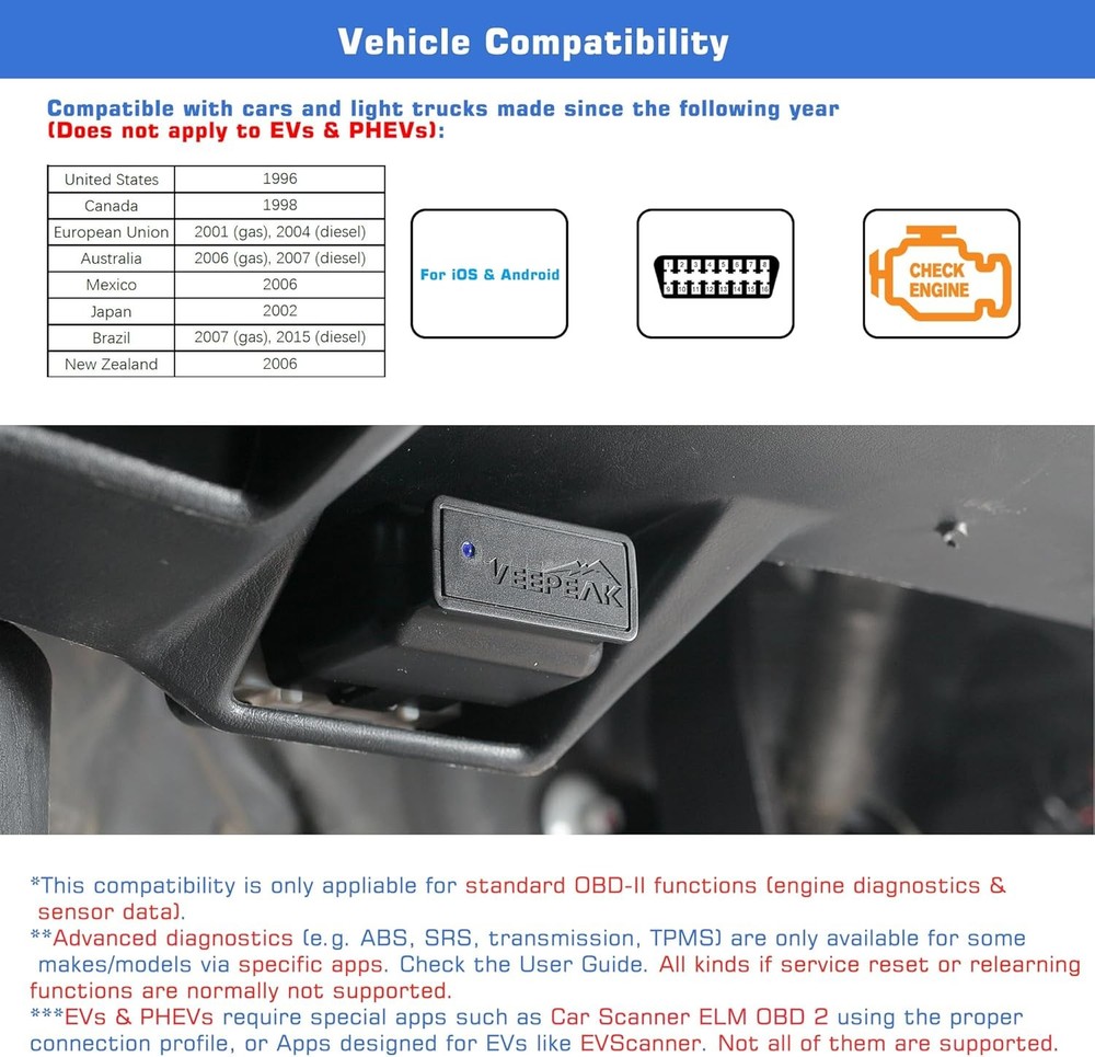 Free eBay listing template designed by dewiso.com Veepeak OBDCheck BLE Bluetooth OBD II Scanner Car Check Engine Light Code Reader Diagnostic Scan Tool for iOS & Android FREE AND FAST SHIPPING! About this item GENERIC OBD-II FUNCTIONS – Find out why the check engine light is on; read & clear trouble codes, view freeze frame data, I/M readiness, and live sensor data to help monitor vehicle health and diagnose check engine problems. COMPATIBLE WITH POPULAR THIRD-PARTY APPS: Car Scanner ELM OBD2, OBD Fusion, Torque (Android only), Infocar, BimmerCode*, BimmerLink*, OBD JScan, Dr. Prius, OBDocker, etc. Note: some Apps or in-App features require separate purchase. See image for details. VEHICLE COMPATIBILITY: Compatible with most 1996+ cars and light trucks in the US for standard OBD-II functions. For EVs, check in Car Scanner App or contact Veepeak to confirm compatibility before purchase. Not all EVs are supported. COMPATIBLE WITH IOS & ANDROID: Supports Bluetooth LE and Classic Bluetooth for Android, and Bluetooth LE for iOS devices. Bluetooth LE requires direct in-app connection; do not connect in Bluetooth settings. Android head units may not be supported. *APP LIMITATIONS: When used with BimmerCode, only 2008+ E, F, I, and 2008+ R series are supported (pre-2008 models or G/U series not supported). Not suitable for pre-2008 models for BimmerLink. NOT compatible with Carly, MHD, xHP, ProTool, bootmod3, etc. Avoid Apps with names that imitate “Torque” or “Car Scanner.” Advanced diagnostics (ABS, SRS, TPMS, etc.) and data (like transmission temperature) are only available for some makes/models via specific apps. MS-CAN, and advanced functions like service reset, relearning are NOT supported. Please refer to product description, User Guide, or contact Veepeak to check availability. (Usually NOT free for advanced diagnostics or features) Product We offer a 30-Day Return Policy on items which you are not completely satisfied with. You have the option for a full-refund or an exchange of the item. No returns are available on items shipped outside of the US . Shipping We offer Free Shipping to the US and ship within 2 business days of payment, usually sooner. We use UPS express shipping. That's why your products are usually delivered within 3 days . Contact We try our very best to make sure every customer is completely satisfied. If there's a problem , message us! We're happy to help. 24/7 live chat available.