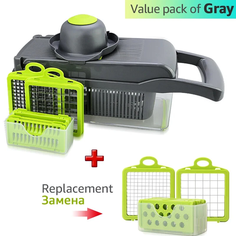 Multifunctional 9-in-1 Food Choppers Vegetable Slicer with 7 Blades, Colander Basket, Container for Salad Potato Carrot Garlic Name:9-in-1 Multifunctional vegetable chopper Material:ABS + stainless steel blades Usage:7 Blades for chopping/dicing/slicing Feature: easy to clean,and easy for storage for all parts of the onion chopper. Volume: Colander is 1.5L, storage container is 2L Washing tips: wash below 60℃ Superior Quality 100% brand new,the onion vegetable chopper dicer is made of high quality BPA-free food grade ABS plastic material,durable and last-long.For better using performance,we adopt the ultra-sharp 420-grade hardened stainless steel blades for chopping/dicing hard vegetables.Heavy-duty stainless steel blades are sharp enough to cut most kinds of vegetables and fruits. 7 INTERCHANGEABLE Blades Humanized design, this vegetable food chopper have 8 types of interchangeable blades,which can give you numerous ways to slicing,shredding, grating. Food can also be cut into different thickness of silk and slices. So functional vegetable chopper gift for cooking lover. A good kitchen helper: Ideal for cutting tomatoes, peppers, carrots, tomatoes, beets, cucumber, onions, garlic and celery. So functional vegetable chopper for cooking lover. Space-saving and good storage: Easy to disassemble with the blades and other accessories,you can store them in the container of the vegetable chopper slicer,help keep your kitchen clean and tidy. 7 mm, small cubes Remove the onion, not the eye 14 mm fruit cubes Quick cut fruit, watermelon, cantaloupe, fruit, etc strip cutting steps 1: cucumber cut, height should not exceed 5 cm 2: cucumber section on the blade 3: quickly press the press plate 4: the cucumber is cut 5: after use, you can use a cleaning brush to clean up the residue, convenient and fast how to cut fancy potato rotate it 90 degrees at a time Hand-guard Covers: Humanized design about the onion chopper slicer, can help protect your hands when working. Drain Basket: With the drain basket design,you can filter the extra vegetables water to the containers of the choppers,space-saving,no mess,very convenient to use.