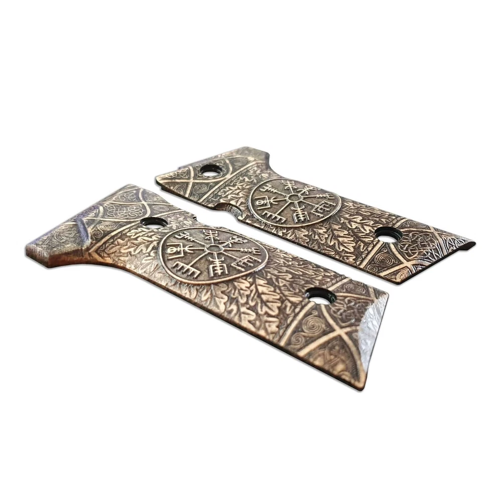 New Beretta 92X, M9A3, M9A4 grips with "Vegvisir" design. Carved from solid natural wood - Cut by CNC. Sanded, painted and oiled by hand