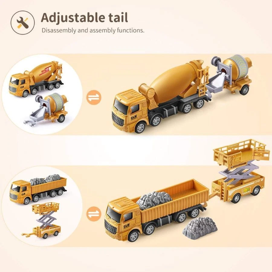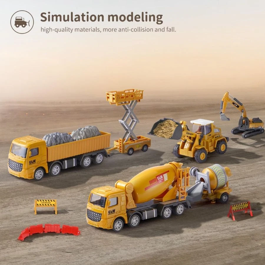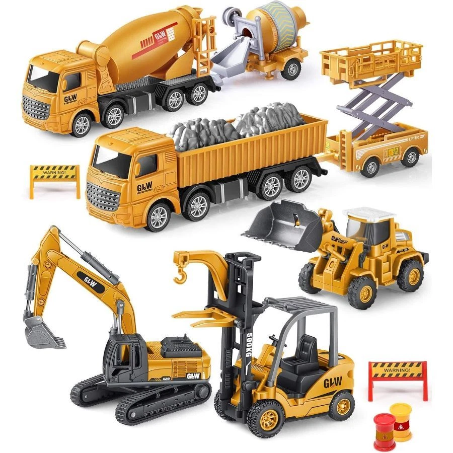 COMPLETE CONSTRUCTION TRUCK PLAYSET: Including Truck trailer, Cement mixer trailer, Excavator, Forklift, Bulldozer Loader and safety barriers, cones and signs,plastic figures. Children can build different construction site scenes while play with them. Also great for summer beach sand toys. PREMIUM MATERIAL: Made of high quality Metal alloy and . All are drop-resistant and durable vehicle, these construction trucks have smooth edges without burrs. Great for for kids 3 years old and up . PRETEND PLAY WITH IMAGINATION: 1. Each truck has a moveable working arm, kids can do all kinds of construction job with the vehicles. 2. Simulation of real construction site scenes with different of truck and figure.Create a world of engineering for kids to explore freely. Top rated toys for kids to develop thinking skills, hand-eye coordination, gross motor skills, and cognitive processes. GREAT GIFT IDEA: for kids that love to play construction truck games indoor and outdoor. Perfect gift for birthday parties, festivals and holidays. Give your child a gift that creates endless happy moments! On Jan 14, 2025 at 18:43:29 PST, seller added the following information:
