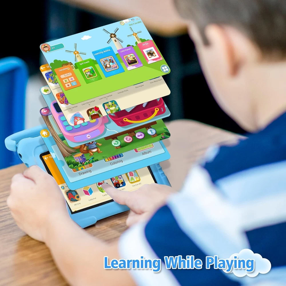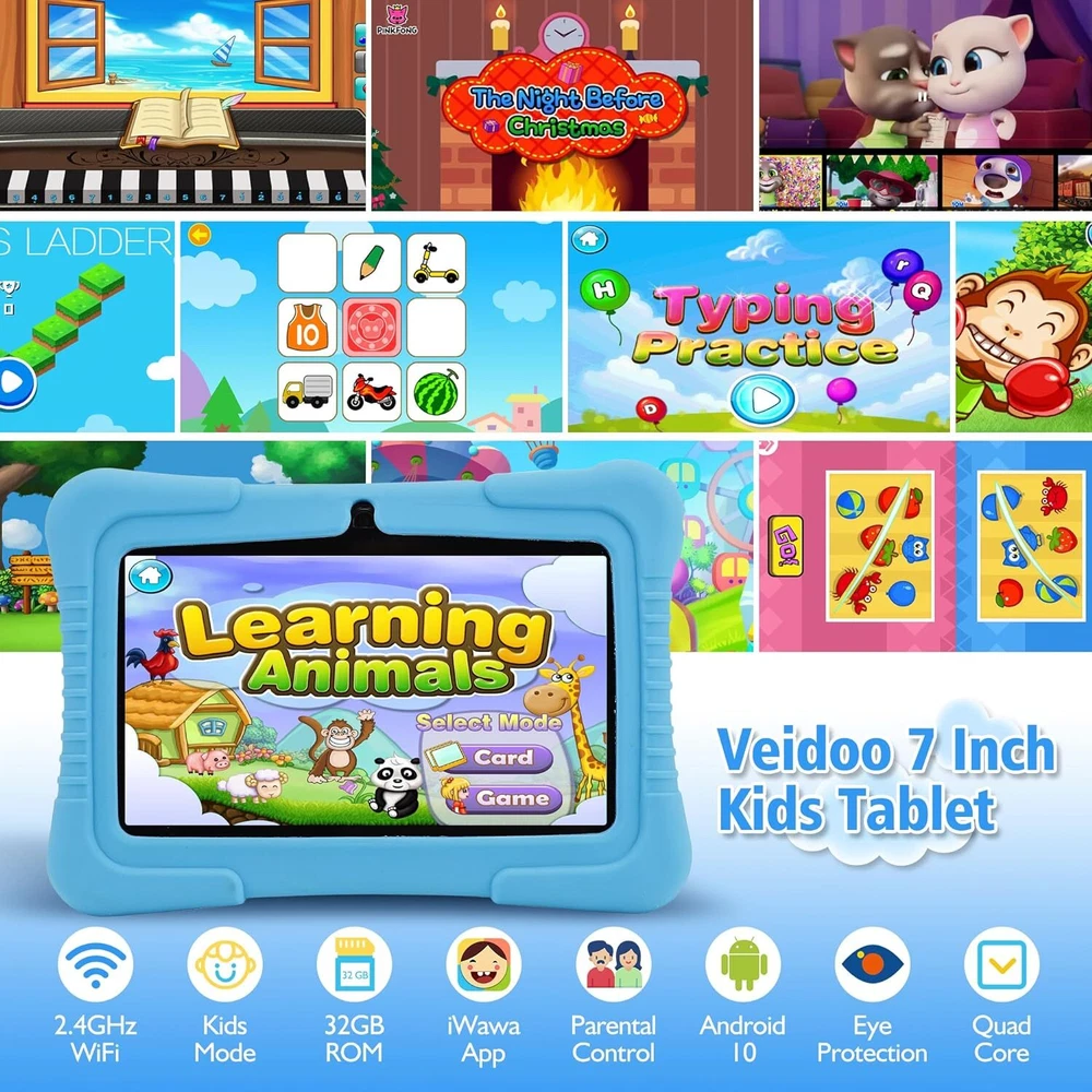 Veidoo Kids Tablet, 7 inch Android Tablet PC, 2GB RAM 32GB ROM, Safety Blue Product Details Standing screen display size: 7 Inches Screen Resolution: 1024 x 768 pixels Max Screen Resolution: 1024x600 Pixels Processor: 1.6 hertz RAM: 2 GB Memory Speed: 1.6 GHz Wireless Type: 2.4 GHz Radio Frequency Average Battery Life (in hours): 3 Hours Brand: Veidoo Model Name: V88 Memory Storage Capacity: 32 GB Screen Size: 7 Inches Display Resolution Maximum: 1024x600 Pixels 【Parental Control Mode】This kids tablet is especially designed for kids to focus on building a safe entertainment environment. You can create and customize profiles for kids’ accounts, hand-pick content for your kids, control screen time and ensure they are browsing safe websites. 【iWawa APP with parental control】: This tablet has passed the GMS certification and is pre-installed with the iwawa app, specially designed for children. It has password control, remote video control, one-button lock screen, alarm setting, and Learning,art, smart games. 【Powerful Function】: Upgraded quad core CPU with Android operating system, support wifi, bluetooth, GPS, etc. The HD 1024*600 display can offer a high quality audiovisual experience, you can expand the storage to 64 GB of SD cards for storing photos, music and videos with additional micro SD card extensions. 【Ideal Gift】: The tablet PC can bring a lot of fun and knowledge for your kids, absolutely worthy to get one. Best gift choice for Christmas, New Year, Easter and Birthday. 【How to Connect to WiFi】: Entering the Iwawa interface, the settings and status bars will be locked. To reconnect to WiFi, please exit the child interface before connecting.