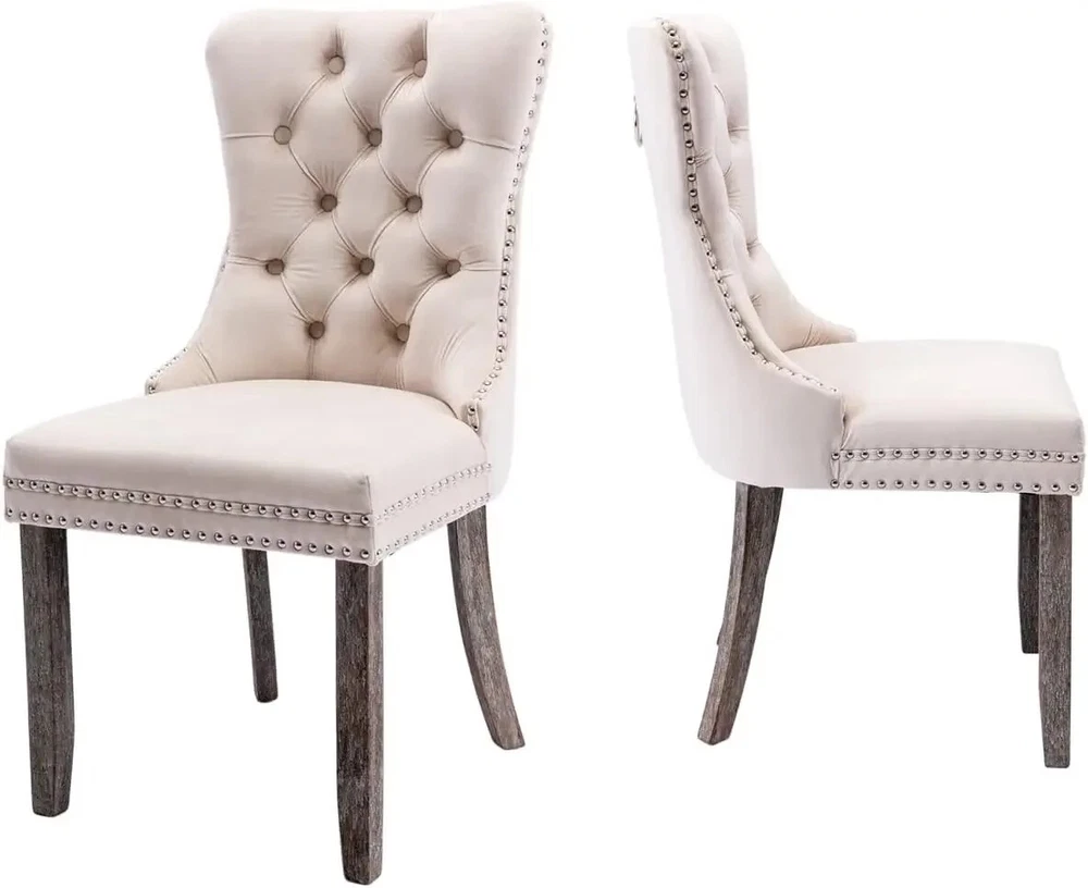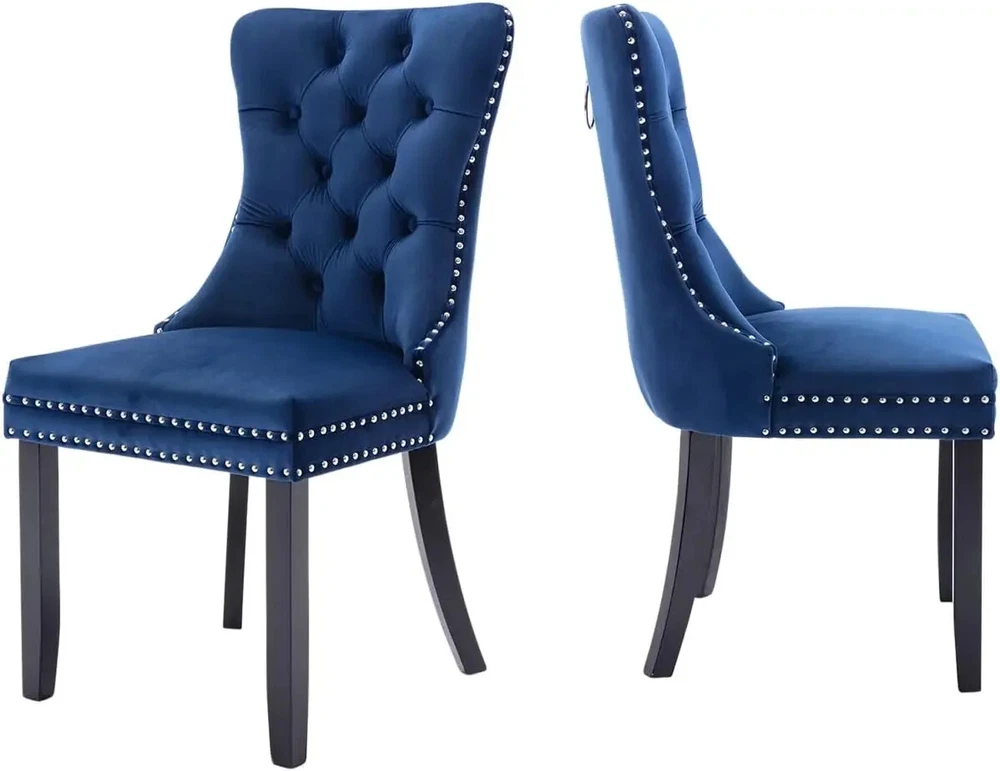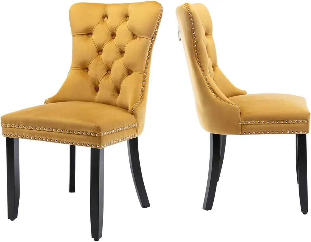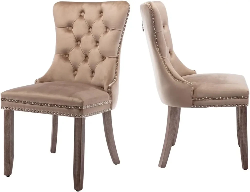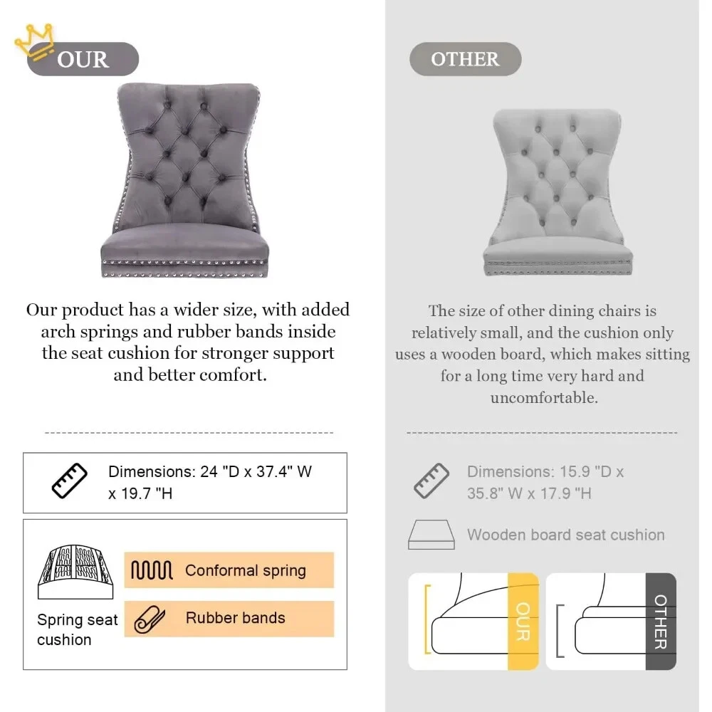 Color Grey Product Dimensions 24"D x 20"W x 38"H Size set of 6 Back Style Solid Back About this item Quality velvet fabric: These wingback dining chairs are made of high-quality velvet fabric, which has super wear resistance and will not fade, the fabric is thick and luxurious, the touch is very delicate. This velvet dining chairs set featuring a very modern mid-century look. Ergonomic High Back: This wingback dining chair set is equipped with high backrest for a strong comfortable back support. Plenty decorative rivet inset around cushion and back not only make it looks noble and elegant but also give the whole chair a feeling of exquisite luxury. Soft and Comfortable Kitchen Chairs: The Cushion uses a high elasticity foam and multilayer board, double elastic structure with a high rebound sponge, providing you with a comfortable seating experience. And brings a very warm atmosphere into dining room,sitting room and apartment. Sturdy Upholstered Dining Chairs & Easy to Assemble: The chair's frame and legs are made of solid wood with enough security to hold up to 280 pounds. Please use the instructions and assembly tool inside the package to complete the assembly. Adjustable pegs on the legs allow you to adjust the height of the legs. After-sales Service: We provide two years warranty and free return for quality problems, if you are unsatisfied with our product, please feel free to contact us and we will reply within 24 hours. We will give you the best service. From the brand Product Description Dine-in luxurious style with this Upholstered Dining Chair Featuring a curved high back, plush cushioned seat and deeply tufted velvet upholstery studded with nailhead, this dining chair is sure to take your dining experience to a whole new level. Solid rubber wood legs provide sturdy support and complement the stunning upholstery for a sleek, contemporary design. Perfect for desks, dining rooms, living room, or sitting areas, this upholstered side chair strikes a traditional silhouette.Luxury Velvet fabric with with thick cushion upholstered on a durable solid wood frame. Velvet Dining Chairs Luxury Velvet fabric with with thick cushion upholstered on a durable solid wood frame. Thick sponge filling, delicate nail decoration, cluster decoration and solid wooden frame make this chair outstanding and charming. The Deep button tufting adds extra comfort and accents the stylish piece of art dining Chairs. The durable solid wood legs are finished in a vintage color to match any style. Intricate stitching with delicate head trimming, exquisite back curve and clustering details and solid rubberwood legs bring stylish splendor to dining rooms, living rooms, bedrooms or guest rooms. Note: The phenomenon of velvet downing is common, and it will also occur in daily use. Wipe it with a hot towel, and then dry it with a hair dryer. Feature: Main Material: Upholstered Main Material Details: Velvet Weight Capacity: 280 lb. Overall Dimension: inch 20" Width X24" Depth X 38" Height Seat Dimension: 20 W inch 17" D. Seat cushion thickness 5"H. Back Seat Dimension: 19.7 W x inch 20" H ( from seat to top of the seat)