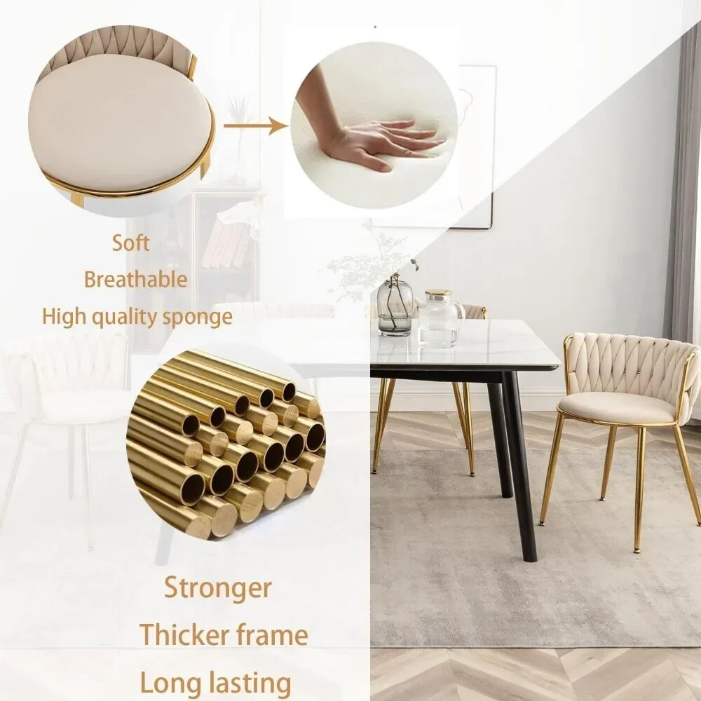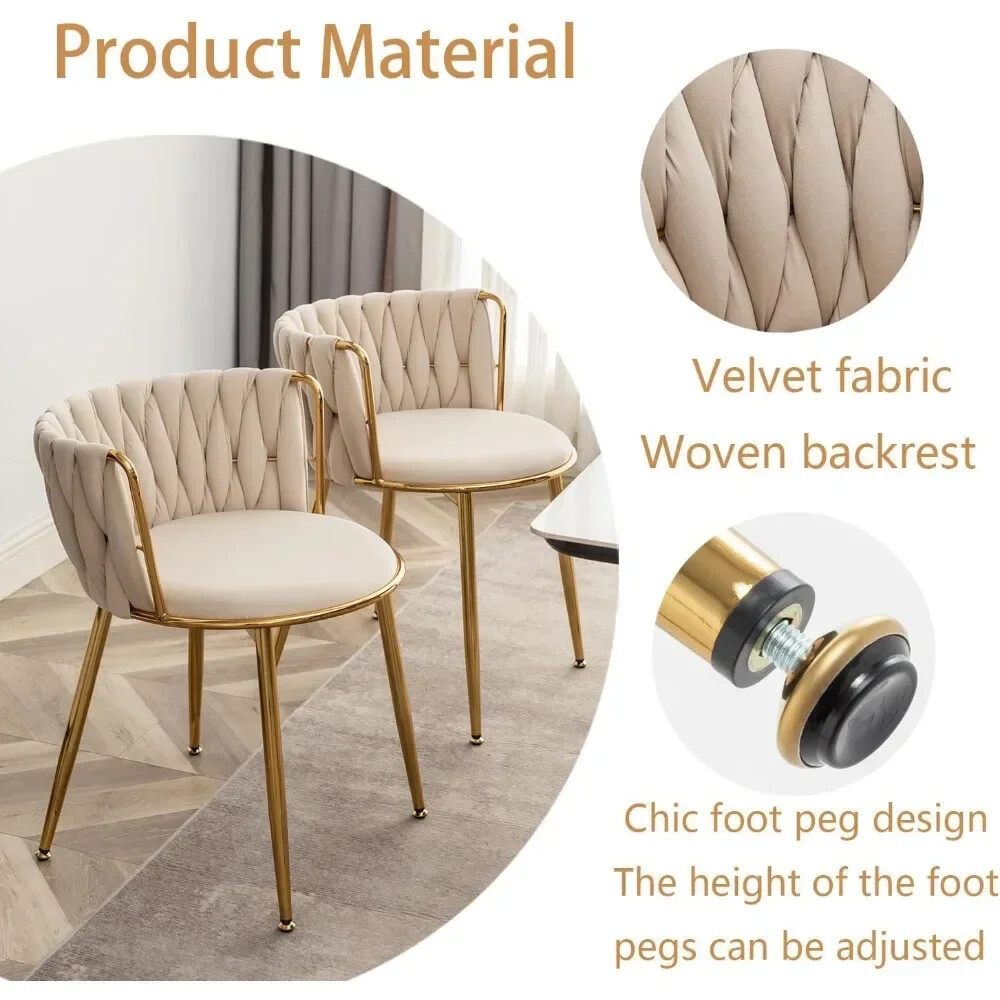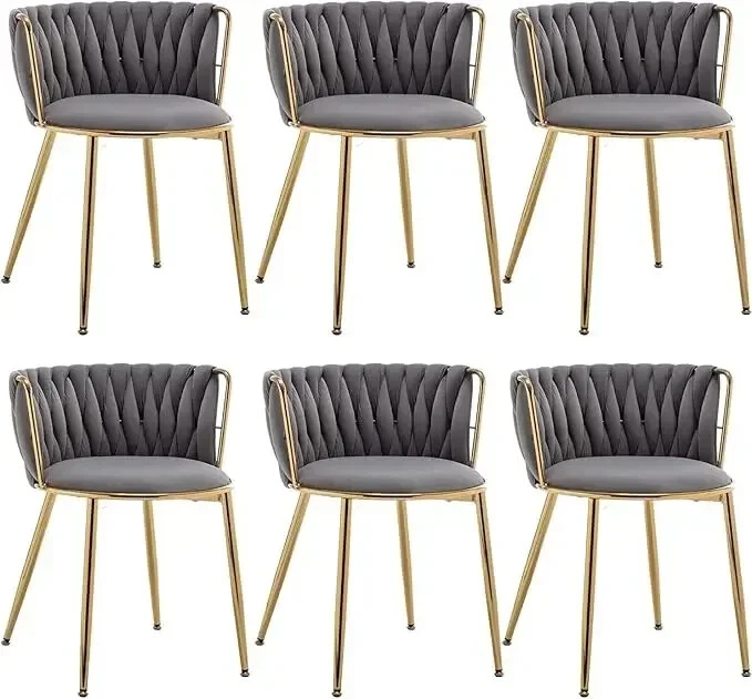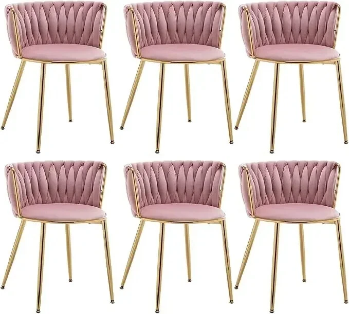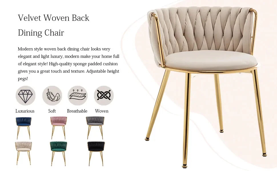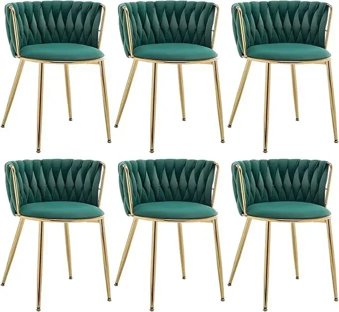 About this item Unique Design: This classic dining chair features a woven backrest design with a gold-plated metal frame for a beautiful and luxurious look. Comfortable Dining Chair: Velvet fabric is comfortable and soft to the touch, high-density sponge cushion, ergonomic tufted backrest, providing better comfort for you and your family. Strong Frame: The dining chair frame is made of solid wood and thickened metal, so the dining side chair is very stable and can support up to 200 pounds. Each leg has height-adjustable pegs, which makes the dining chair better to keep smooth. Versatile: This dining side chair is sturdy and compact and won't take up much space. The luxurious and elegant appearance makes it suitable for dining room, kitchen, living room, bedroom and powder room. Cushion size: 17.7 inches wide and 16.9 inches deep. Please look carefully when purchasing. Product sellpoints Dining Chairs Set Of 6|Velvet Upholstery & Gold Metal Legs:Luxurious velvet upholstery paired with elegant gold metal legs for a sophisticated dining experience. Ergonomic Tufted Backrest:Ergonomically designed tufted backrest ensures comfort during long dinners. Sturdy Woven Backrest:Durable woven backrest offers a classic design with lasting support. Adjustable Height Metal Legs:Adjustable pegs on the metal legs provide stability and smoothness on uneven floors. Versatile Dining & Accent Chair:Versatile design suitable for dining rooms, kitchens, living rooms, and more. Product Description