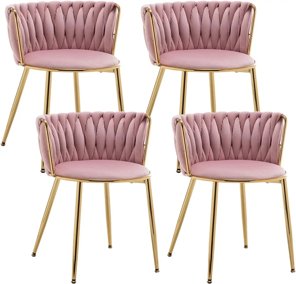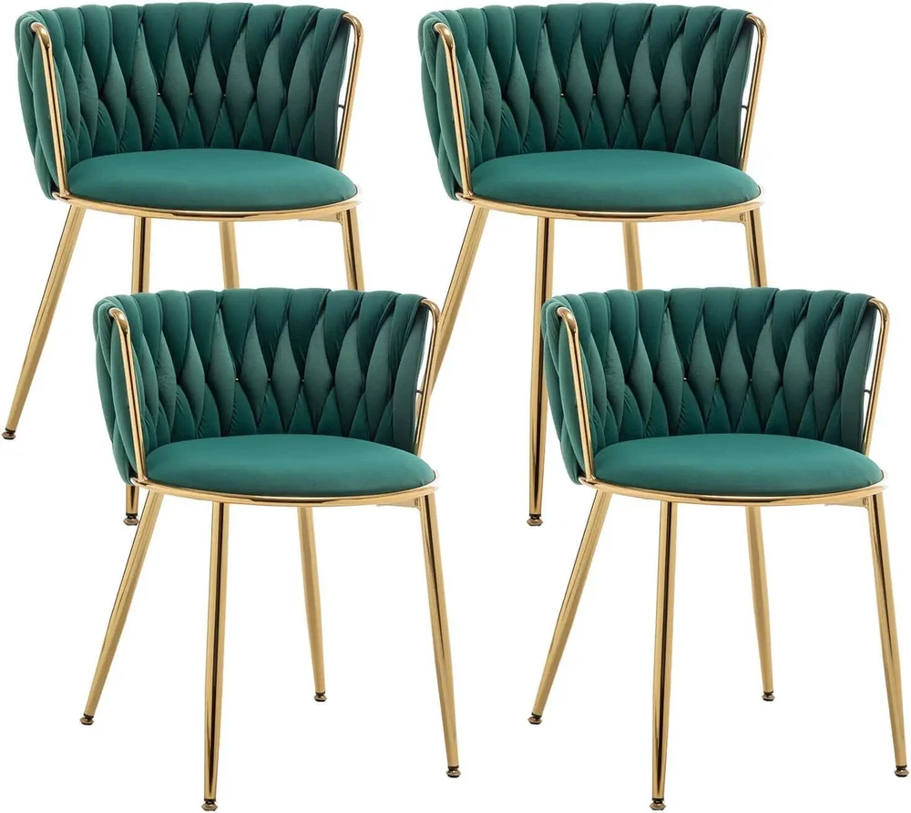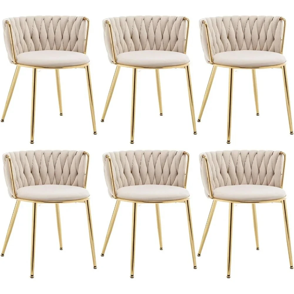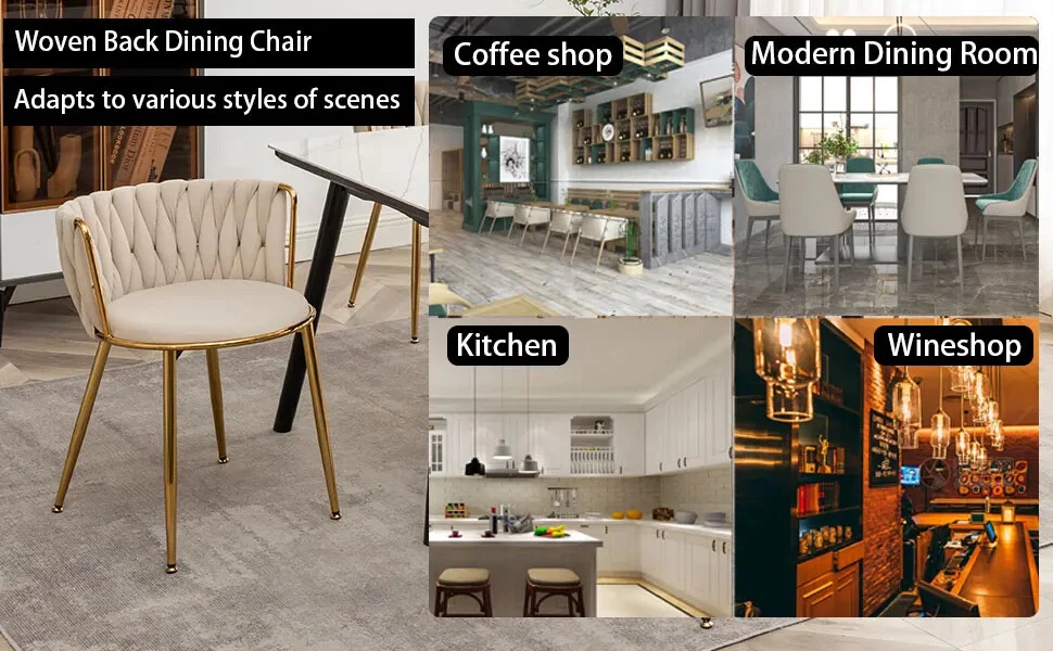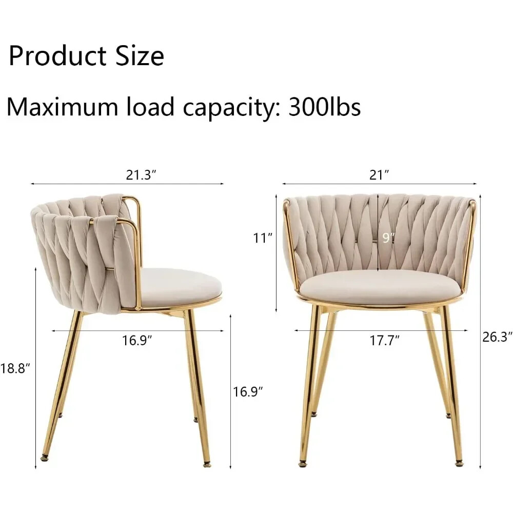 About this item Unique Design: This classic dining chair features a woven backrest design with a gold-plated metal frame for a beautiful and luxurious look. Comfortable Dining Chair: Velvet fabric is comfortable and soft to the touch, high-density sponge cushion, ergonomic tufted backrest, providing better comfort for you and your family. Strong Frame: The dining chair frame is made of solid wood and thickened metal, so the dining side chair is very stable and can support up to 200 pounds. Each leg has height-adjustable pegs, which makes the dining chair better to keep smooth. Versatile: This dining side chair is sturdy and compact and won't take up much space. The luxurious and elegant appearance makes it suitable for dining room, kitchen, living room, bedroom and powder room. Cushion size: 17.7 inches wide and 16.9 inches deep. Please look carefully when purchasing. Product sellpoints Dining Chairs Set Of 6|Velvet Upholstery & Gold Metal Legs:Luxurious velvet upholstery paired with elegant gold metal legs for a sophisticated dining experience. Ergonomic Tufted Backrest:Ergonomically designed tufted backrest ensures comfort during long dinners. Sturdy Woven Backrest:Durable woven backrest offers a classic design with lasting support. Adjustable Height Metal Legs:Adjustable pegs on the metal legs provide stability and smoothness on uneven floors. Versatile Dining & Accent Chair:Versatile design suitable for dining rooms, kitchens, living rooms, and more. Product Description