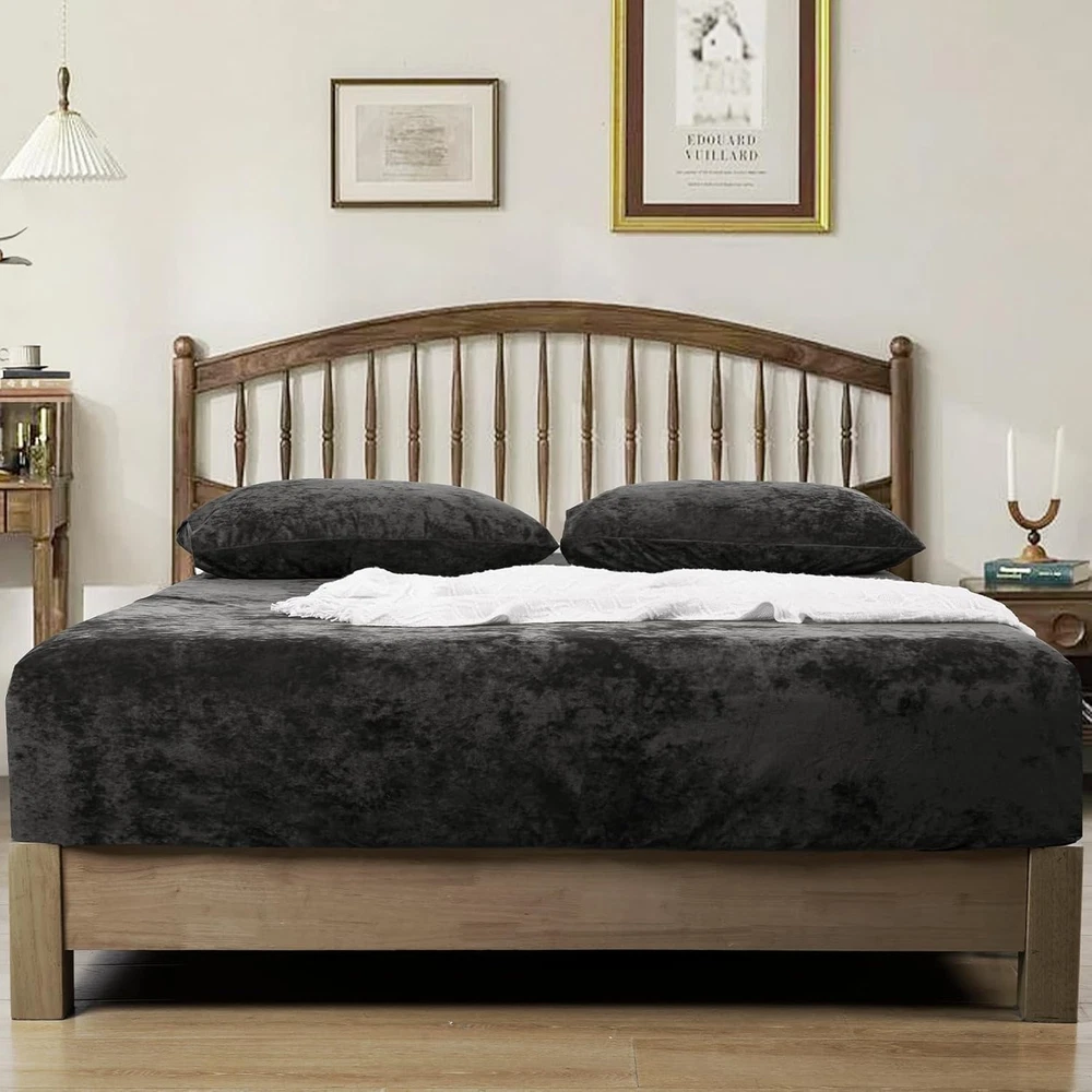 Chosen Velvet Fabric: The fitted sheet is made of 100% selected velvet fabric, fluffy, soft and skin-friendly, providing comfy and cozy sleeping experience for you and your family. Elegant Appearance: The velvet fabric with specail craftsmanship feature not only soft and uinform luster, but also amazing light and shadow effect in different light intensity and angle. Giving a luxurious allure for an impressive coordinating foundation with our premium velvet fitted sheet. Secure & Snug Fit: Measuring 80" by 60" with 15" deep pocket, our fitted sheet is designed for all queen sized bed mattress. With full and reinforced elastic band at backside, it will safely and securely cover your mattress. Easy Care: Machine wash separately in cold water, gentle cycle. Do not bleach. Tumble dry on low heat or lay flat to dry. Remove promptly. Warm iron as needed. No pilling, no shrink, no fade, no shed, labor tests show that the velvet fitted sheet keep its shape and stay brands new after 102+ wash cycles. Package Include: PHF Super Soft Velvet Fitted Sheet Queen(80" x 60" x15''), perfect for queen sized bed mattress. Product Description The video showcases the product in use. The video guides you through product setup. The video compares multiple products. The video shows the product being unpacked. Selected Velvet PHF fitted sheet is made of 100% selected velvet, sumptuously soft, fluffy and cozy, providing extreme comfort for sweet sleep. Due to a gentle textile process that ensures no shedding or pilling. 360° Extra Strong Elastic Each fitted sheet has full encased elastic band covered with self-fabric at the bottom, can fit your bed mattress snugly and safely without any shifting. 15 Inches Deep Pocket Our premium fitted sheet with deep pocket can stretches up to 15 inches, pull snugly over any mattress up to 15 inches effortlessly and simply, go neatly round the corners to stay in place. Easy to Use Its stretchy or elasticized edges make it a breeze to slip on and off, saving time and effort during bed making and changing linens. 1 Multiple Colors 2 Size Refrence PHF Luxurious & Cozy Fitted Sheet Material Truly Velvet Truly Velvet 100% Washed Cotton 100% Viscose Made from Bamboo Truly Velvet Size Twin/Full/Queen/King/CK Twin/Queen/King Twin/Full/Queen/King Twin/Queen/King Twin/Queen/King Color 10 Colors Available 6 Colors Available 12 Colors Available 11 Colors Available 5 Colors Available Price 28.99-37.99 25.99-32.99 21.99-27.99 25.99-35.99 26.99-33.99 Features Elegant Appearance, Soft, Warm Ultra Soft, Warm Cooling, Breathable Soft, Skin-friendly Soft, Skin-friendly Season Autumn,Winter Autumn,Winter Spring, Summer All Season Fall Winter and Spring