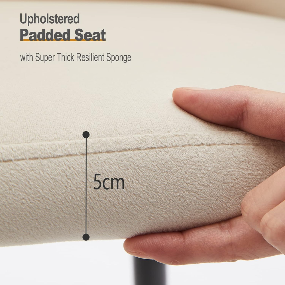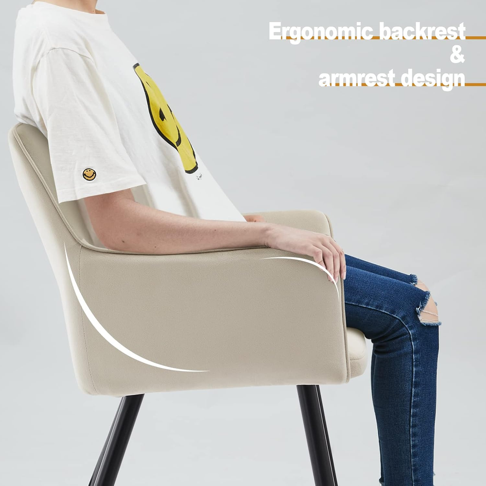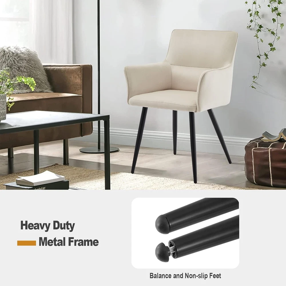 Upholstered seat, velvet chair: Upholstered backrest and seat make it more comfortable and you can sit on it for a long time. Soft velvet cover. Silky feel, soft and breathable, does not pill and has a long service life. Comfortable kitchen chair with ergonomic backrest and armrest: Stretch the shoulders, support the back and buttocks, soothes the legs. Sturdy and robust black metal legs with powder coated process: The material and process of the leg ensure stability and durability. The conical shaped metal leg increases the three-dimensional. Non-slip and scratch resistant pad on the bottom. Available for many occasions: For dining room, living room, bedroom and kitchen. For commercial reception and restaurants. Modern Chairs with Wide Seat: 16.5 inch wide seat offers you plenty of seating area, comfortable sitting. Seat height: approx. 18 inch. Dimensions: 21.6 x 19.7 x 33 inch. Product Description TUKAILAi Leisure Dining Chairs, Velvet Comfy Lounge Chair with Armrest, Backrest and Metal Legs (Cream) Comfort dining chair with ergonomic backrest and armrest Features: Ergonomic backrest and armrest Ergonomic chairs with backrest, armrest and curvature shape make sitting feel more comfortable. Curved Backrest Give your body strong support. Stretch the shoulders, support the back and buttocks, soothes the legs. Comfy Chairs with Wide Seat 43cm/16.9inch wide seat offers you plenty of seating space, comfortable sitting. Seat height approx. 46cm/18.1inch. Soft Velvet Material Soft velvet cover. Silky feel, soft and breathable, won't pill and has a long life. Fully Upholstered Chair Super thick foam filling on backrest and seat make it more comfortable and you can sit on it for a long time. Delicate Sewing The wiring is even and smooth, making the internal filling more uniform and the appearance more detailed. Simple Modern Design Make a clear difference to most traditional kitchen chairs. Give your space more special and different feel, while being less cumbersome but full of fashion. Strong and Durable The chair with metal legs is stable structure. No need to worry about security issues. Maximum load 120kg/264lb. Cone-shaped Metal Leg with Non-slip Pad The conical design increases the three-dimensionality of the product. Adjustable feet prevent floor scratches and are silent during travel. Metal black powder coated is wear resistant and easy to clean, not easy to rust. Specifications: Material: Velvet and Metal Dimensions: L43xW52xD83cm/16.9x20.5x32.7inch; Seat height: 46cm/18.1inch; Seat depth: 41cm/16.1inch Net weight: 7.2kg/16lb; Load weight: 120kg/264lb Easy to assemble: Simply assemble the legs to the seat in a few simple steps. Package: Chairs + Fittings + Instructions Available for many occasions - Such as dining room, living room, bedroom, kitchen, lounge, restaurant and commercial reception.