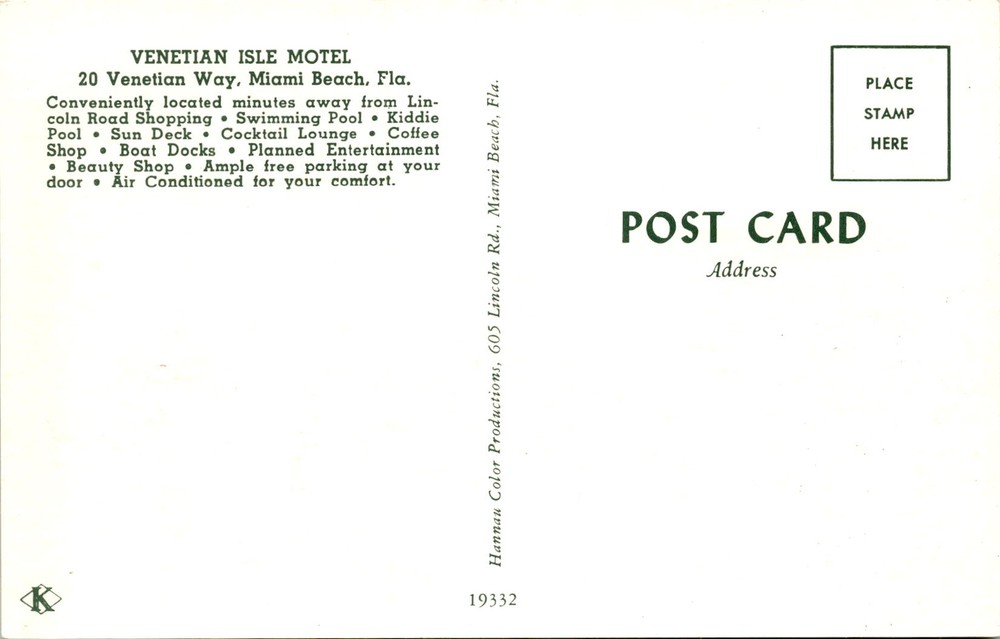 MAKE AN OFFER. THE MORE YOU BUY THE BETTER DEAL I WILL ACCEPT The postcard advertises the Venetian Isle Motel located at 20 Venetian Way in Miami Beach, Florida. The motel offers various amenities such as a swimming pool, kiddie pool, sun deck, cocktail lounge, coffee shop, boat docks, planned entertainment, beauty shop, and ample free parking.