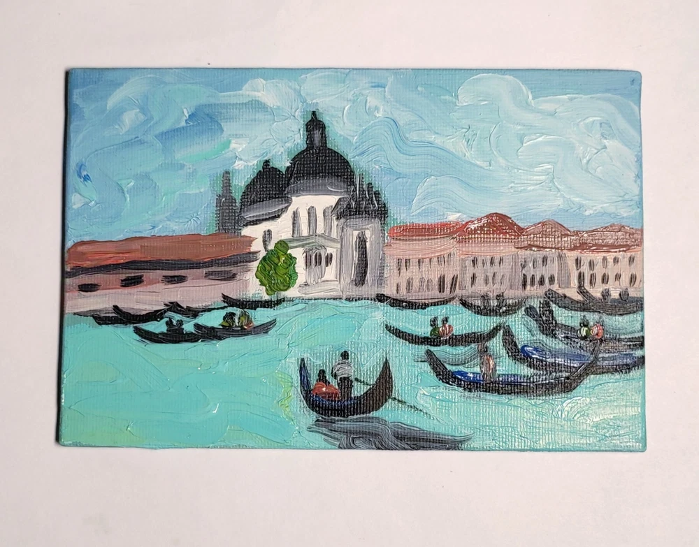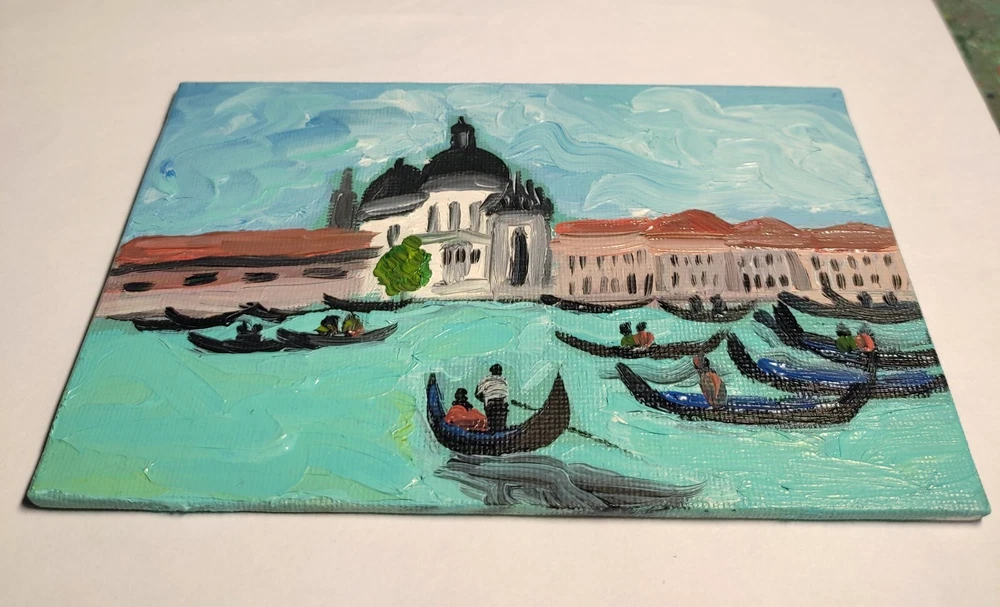 Venice Italy. Original Oil Painting (6''x4'' - 10x15 cm). Canvas board. Handling time for 1-3 days after receving your payment. Estimated shipping time is 15 to 30 business days. I ship Standard International Belarus post worldwide. Free shipping. The artist Veranika Krasnova (art name Roni Goldfinger) has been working for 15 years using the original and unique technique & "finger painting" technique, that determines the name of her paintings and art gallery. The subject of Roni’s interest is not only the technique of “finger painting”, but, as well, is the way of it’s artistic expression. She steps over the usual use of the paint brush using the oil paintings and turns it into an absolutely direct tactile way of communication with the canvas. That provides the highest relationship between the author and her works. When we talk about the art types and art works, where the object is not just an art-made, but a hand-made, we note that there is a special energy connection between the intellect, emotions, elusive fluids and psychological strings. As a rule, painting has an intermediary between the author and the canvas like a paint brush, paints, etc. Roni writes with her own hand using her own five-fingered brush: from the broadest (palm) to the thinnest (pinkie). They are full of bright fantasy and live joy, taken from her personal impressions and dreams. It would seem that Roni describes the famous countries, cities, motifs - basic textbook signs in her paintings: Red Lights - in Amsterdam, Moulin Rouge – in Paris, The Guard of the Pyramids of the Sphinx – in Egypt and etc. During the process of painting she uses her own outlook, gives her own perspective, changes the age of the actors if it’s required and remodels the world into the irony-free universe and a carnival bacchanalia. There is a place for everything inside her art: for always mutual love, for conversation always with the interlocutor, for partnered dancing, for meetings without parting. If you look for stylistic analogues of what Roni Goldfinger does, you will find out that it’s an obvious instinct that is not just played by a professional, but sincerely created by a person without the standards of professionalframeworks and canons.
