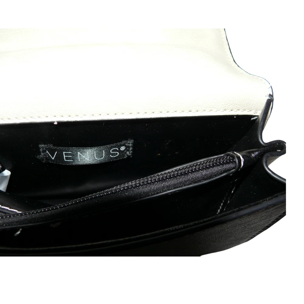 Venus handbag/cross body bag. Silver tone hardware with silver tone studs and faux turquoise cabs. Western themed. Chain and Polyurethane adjustable handle. Lined. One interior zippered pocket and two sections.