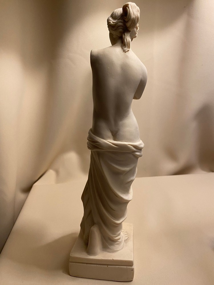 The "Venus de Milo" figurine sculpture stands at 11-1/2 inches tall including the base. The statue is of medium size and has an alabaster color, depicting a figurative art style of the Greek goddess Venus. The sculpture is a representation of classical art and would make a stunning addition to any art collection or display. The base measures 3" square and 1" high and weights 1 lb 13 oz.
