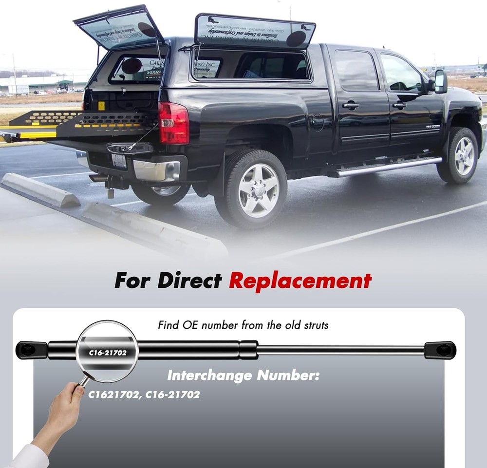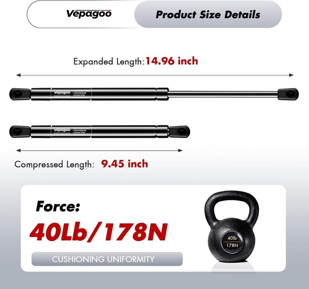 Vepagoo C16-21702 15 inch 40Lb/180N Gas Shocks Struts Spring 15 inch, Black Product Details Compressed Length: 14.45 Inches Manufacturer: Vepagoo Item Weight: 10.6 ounces Package Dimensions: 17.04 x 3.82 x 1.02 inches Item model number: C16-21702 Manufacturer Part Number: SH376A Brand: Vepagoo Color: Black Material: Metal Auto Part Position: Center Extended Length: 8.98 Inches 【15 inch Struts for Truck】Extended length: 15 inch, Force: 40lbs Per Strut. Compatible with Leer ARE Snugtop truck camper shell, topper rear window, truck cap canopy, pickup truck toolbox 【Interchange Numbers】C1621702, C16-21702 【5-mins Installation】Swap out your old strut in your garage—grab a head screwdriver. Unscrew the worn parts, then snap the new strut into your vehicle's original mounting points as easily as building with blocks 【Stable Support & Effortless Control】Lift camper shell, or toolbox lids with one hand—no more wrestling heavy; A smooth, cushioned motion silences jarring metal clangs, while preventing dangerous sudden pops or slams