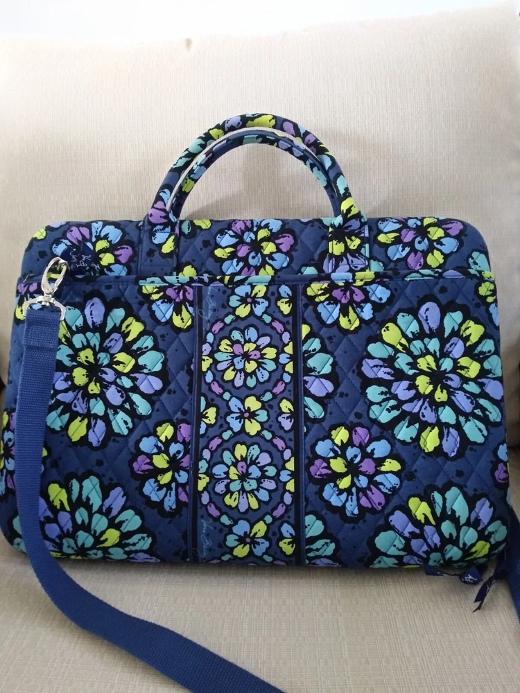 Bag has full length zipper closure pocket on the front and full length slip in pocket in the back Detachable adjustable shoulder strap Will hold loptop measuring 16"×11" or less Bag is in good condition with no stains or wear of fabric