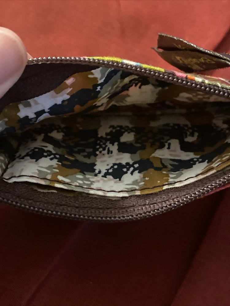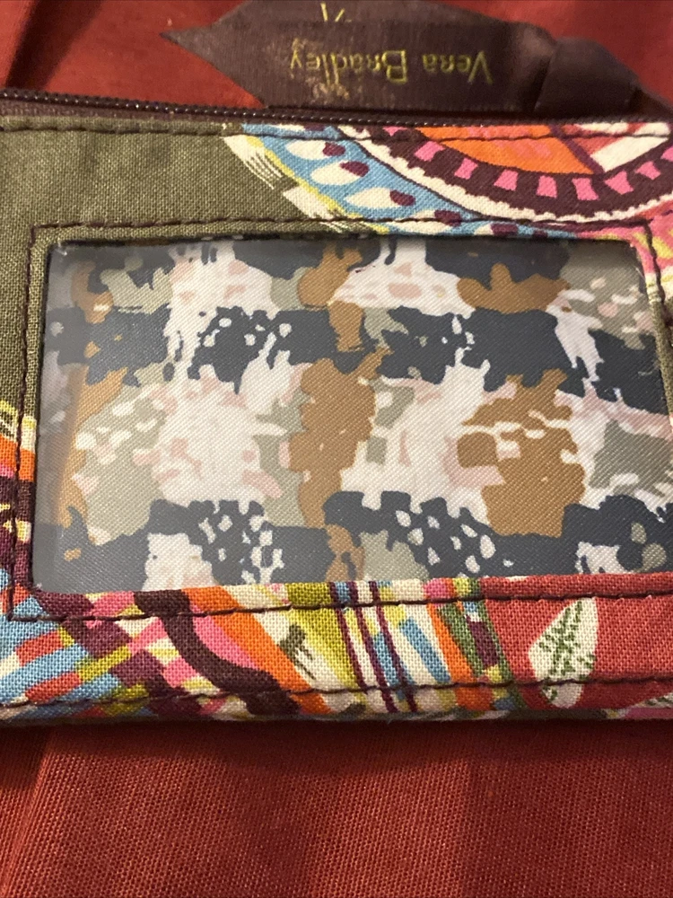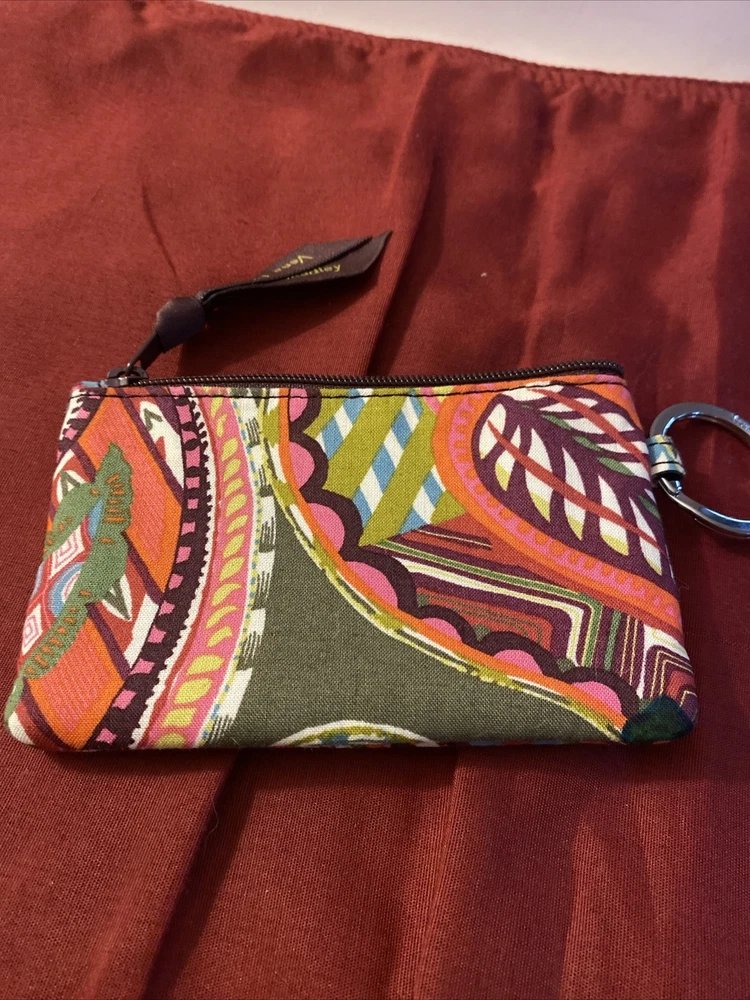 This Vera Bradley coin purse/ID pouch is a perfect accessory for any bohemian-themed outfit. The multicolor floral pattern on the cotton material adds a pop of color to your ensemble. Measuring 5 inches in length and 3 inches in width, it's a perfect size for your coin collection and ID cards. The key chain coin purse style is both practical and fashionable, with the added bonus of a Vera Bradley logo accent. This unit is made in China and is not vintage or handmade. It's a great addition to any woman's wardrobe, especially those who love the bohemian theme.