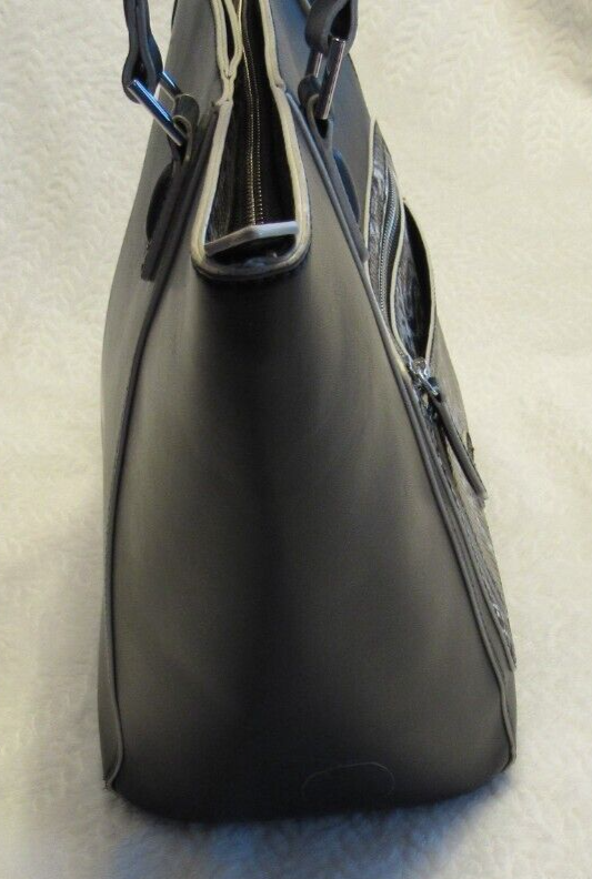 Vera Bradley Ella Tote Purse Bag Black Faux Leather Snake Print Women's Pre-owned in good condition - stain on inside bottom lining -see photos This stylish Vera Bradley Ella Tote in black faux leather features a unique snake print and is perfect for any occasion, whether it be for travel, workwear, or casual use. The tote has a zip closure and double handles with a 12-inch drop, making it easy to carry. It also has an outer zip pocket and an inner zip pocket for added convenience. The hardware is silver in color and the bag has a fabric lining in blue multi. The tote is medium-sized, measuring 10 inches in width, 12 inches in height, and 4.75 inches in depth. It is a rectangular shape and has a key holder as an accessory. The Vera Bradley Ella Tote is a part of the Vera Bradley Tote product line and has a snake theme. The bag is made in China and has a zip top.