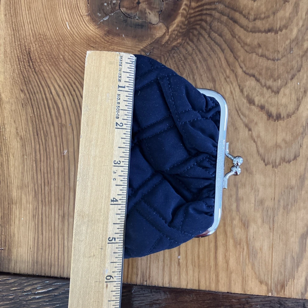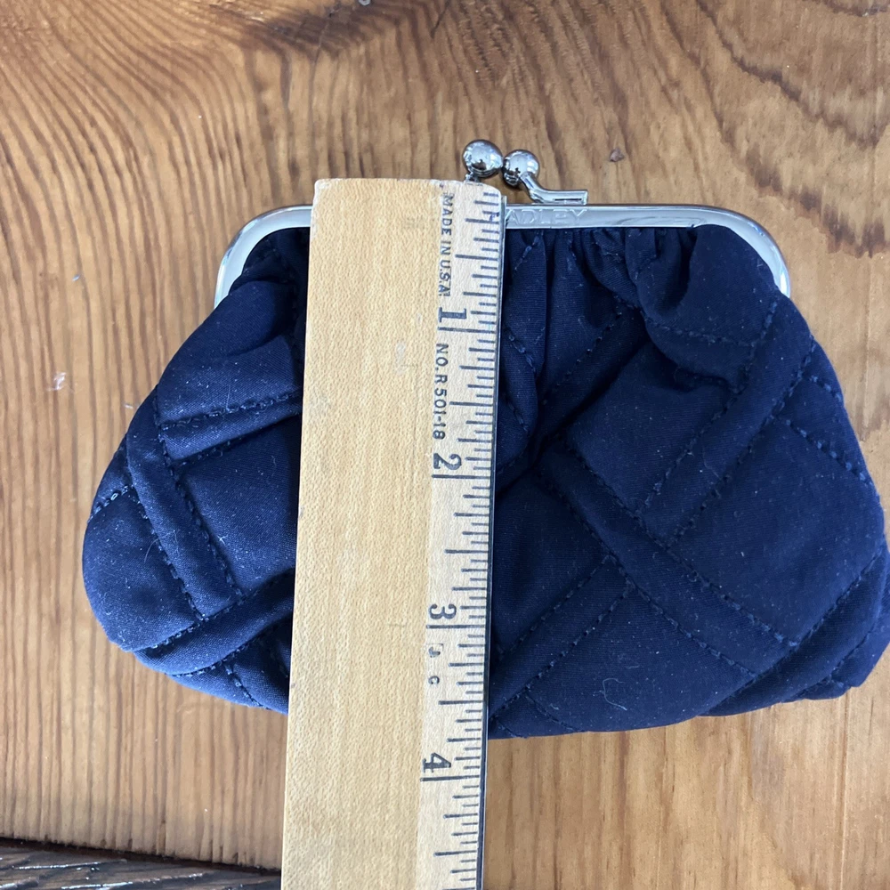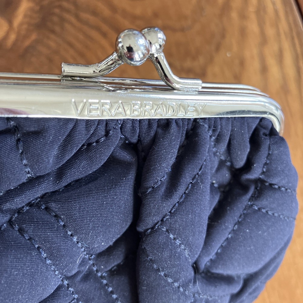 The Vera Bradley Quilted Blue Kiss Lock Coin Purse is a stylish and functional accessory for women. Made of lightweight cotton, this fashionable coin purse features a solid blue color with a garden-themed quilted design. The kisslock closure adds a touch of vintage flair, making it a unique and practical addition to any handbag or purse. Perfect for storing small items like coins and credit cards, this coin purse is both fashionable and functional for everyday use.