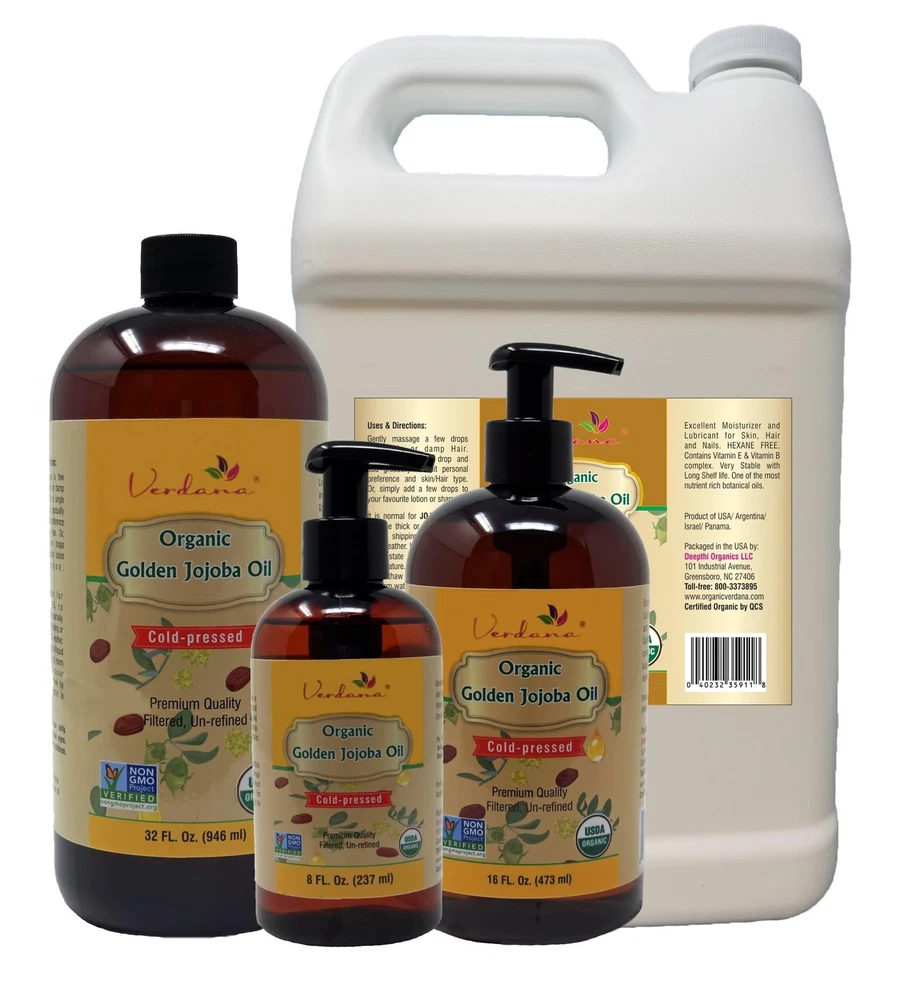 Verdana Organic USDA Certified Organic Golden Jojoba Oil, Cold Pressed, Unrefined, 32 Fl Oz Bulk size - Deepthi Organics Product Details Size: 32 Fl Oz (Pack of 1) Brand: Verdana MPN: 103O-32 UPC: 040232359101 EAN: 0040232359101 Brand: Verdana Item Volume: 32 Fluid Ounces Item dimensions L x W x H: 6 x 2 x 7.5 inches Age Range (Description): Adult Special Feature: Non Comedogenic Product Dimensions : 6 x 2 x 7.5 inches; 2 Pounds UPC : Manufacturer : Organic Verdana USDA ORGANIC JOJOBA OIL: The Verdana jojoba oil is simply 100% Organic Simmondsia chinensis (jojoba seed) oil nothing added and nothing removed. The oil is USDA NOP certified organic, vegan, and free of GMOs. We left this pure jojoba oil in its natural state so that you can use it straight from the bottle or add it to other beauty products. FOR DRY SKIN: Dont you just hate it when your elbows or heels get so dry that they crack? Verdanas 100% jojoba oil is a natural moisturizer, very similar to the sebum that the skin naturally produces. Its safe to use as a facial moisturizer. Gently massage a few drops into the desired area according to your personal preference. FOR DRY HAIR: Are you sick of frizzy hair that has a mind of its own? Tame your frizzy hair and boost hair growth with Verdanas virgin jojoba oil. This also helps with itchy or flaky scalp. Add a few drops to your shampoo or directly to your damp hair. Massage it in to your scalp according to your personal preference. Rejuvenate brittle, frizzy, and dry hair with our jojoba oil. FOR RAZOR BURN: This natural filtered jojoba oil is the perfect solution for razor burn, being non-allergenic and non-comedogenic. Apply the organic oil before shaving to create a smooth surface for shaving. Then, apply it after to moisturize your skin and help cuts heal. NATURAL MAKEUP REMOVER: Our cold pressed jojoba oil is a natural way to remove your makeup every day. Avoid extra dry skin that comes from some makeup removers. Add a few drops to a cotton ball or pad and gently wipe off your makeup. If you have very dry skin, jojoba oil will help to moisturize the areas where you removed the makeup.