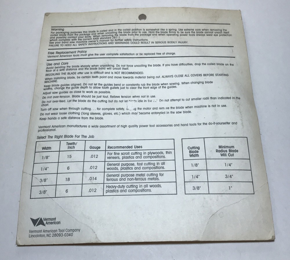 Vermont American 1/8”x 56 1/8” 15 TPI Fine Scroll Woodcutting Bandsaw Blade. Condition is "New". Shipped with USPS First Class.