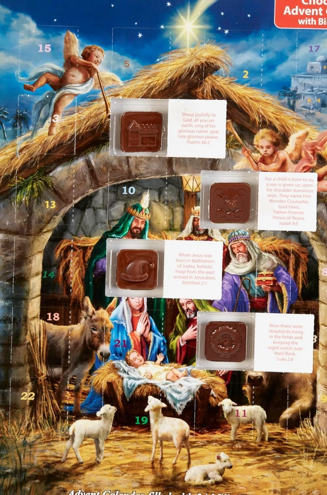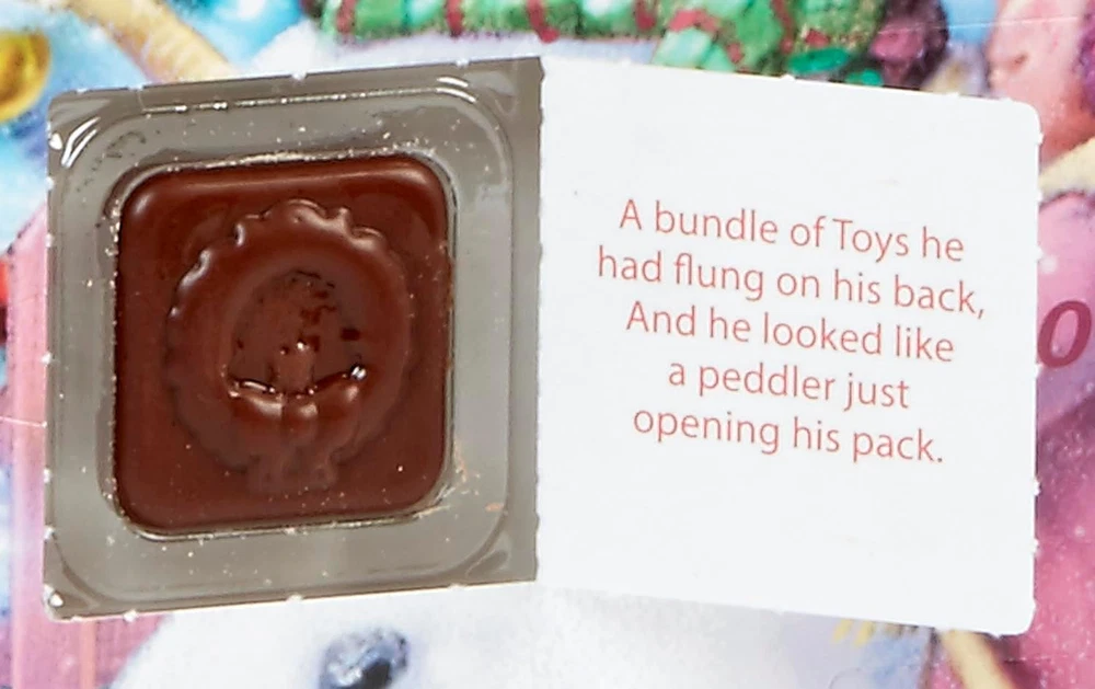 Vermont Christmas Company Elves' Treehouse Chocolate Advent Calendar (Countdown to Christmas) Product Details Manufacturer: Vermont Christmas Company Brand: Vermont Christmas Company Item Weight: 5.3 ounces Product Dimensions: 13 x 10 x 0.04 inches Item model number: BB138 Manufacturer Part Number: BB138 Brand: Vermont Christmas Company Theme: Christmas Format: Advent Calendar Special Feature: chocolate Product Dimensions: 13"L x 10"W Each window opens revealing a piece of gourmet milk chocolate. Also find a verse from "Twas the Night Before Christmas. Calendar contains 2.6 ounces of chocolate. All chocolate produced in Canada. Measures 10" x 13.75". This item does not contain peanuts or tree nuts as ingredients, and is not manufactured on equipment or in a facility that processes peanuts or tree nuts.