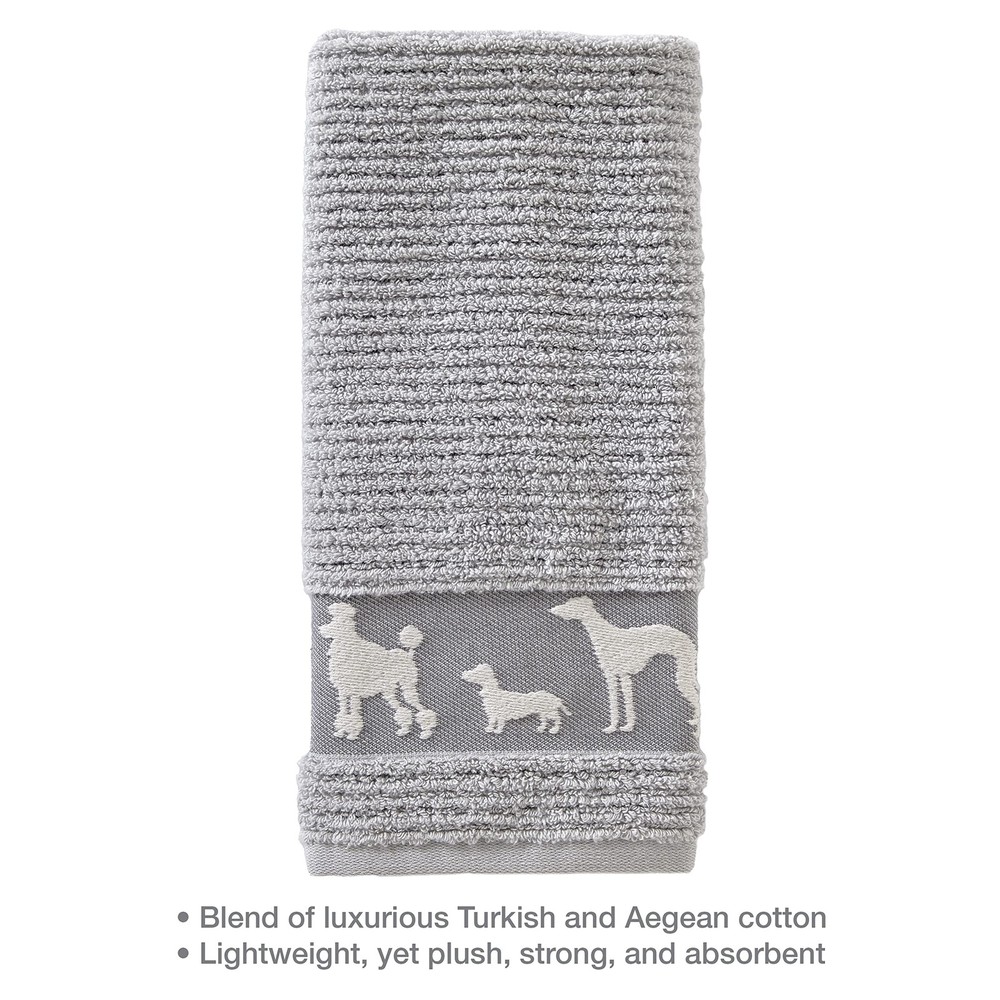 Includes 2 hand towels Part of the Vern Yip by Collection Collaboration with Vern Yip, famed designer of TLC’s Trading Spaces and HGTV’s Design Star Plush textured terry with a woven jacquard dog design along hem Blend of luxurious Turkish and Aegean cotton; lightweight, yet plush, strong, and absorbent