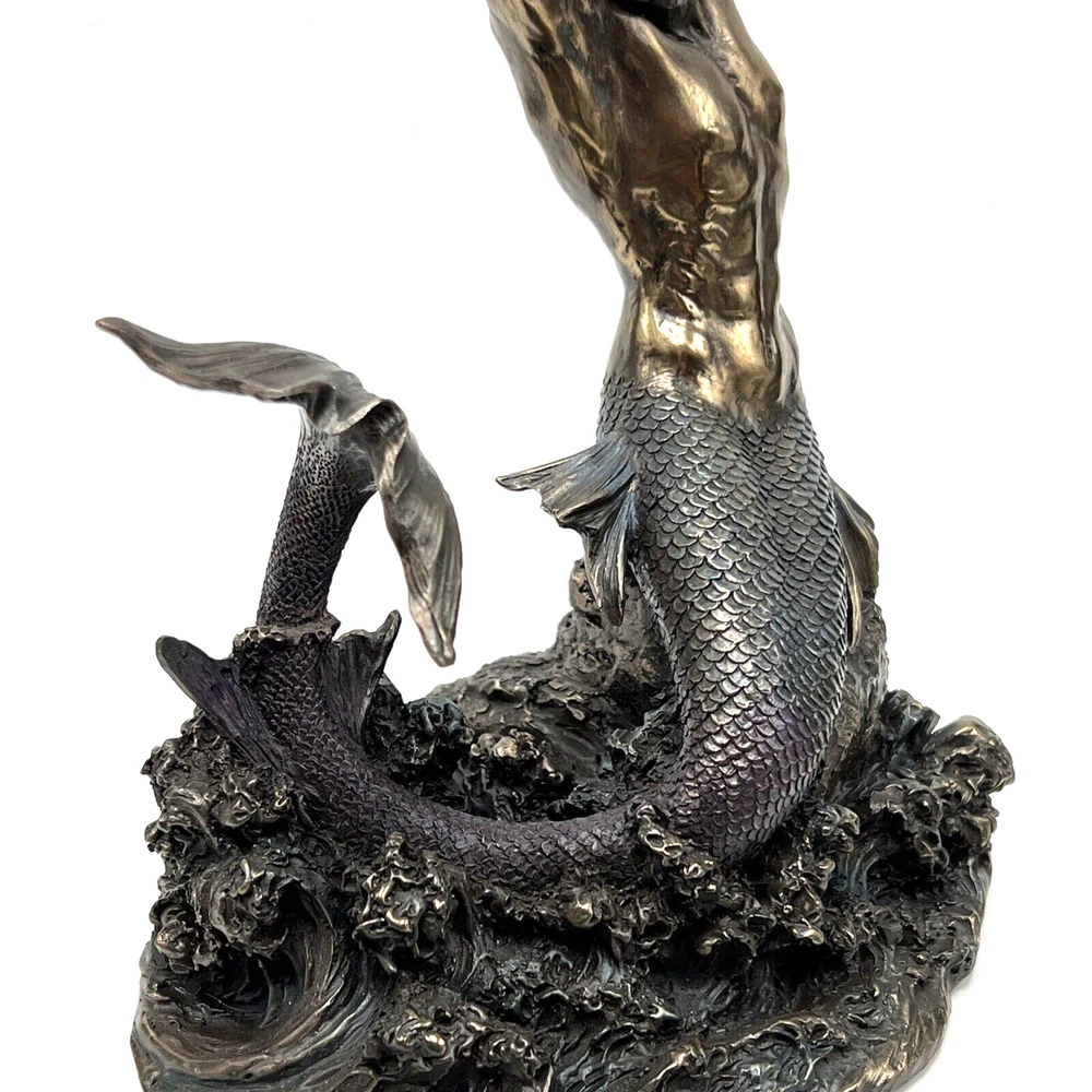 The Veronese Design Merman sculpture is a 7 7/8" tall piece made of bronze and resin, featuring a merman stretching on a rock. It has an antique bronze finish and an eclectic style, perfect for home decoration. The tabletop sculpture has dimensions of 4.25"D x 5.5"W x 7.5"H and weighs 1.4 pounds. Ideal for Mothers or Father's Day, it adds an architectural theme to any space. I will pack with care and get it to you ASAP /thanks for looking !