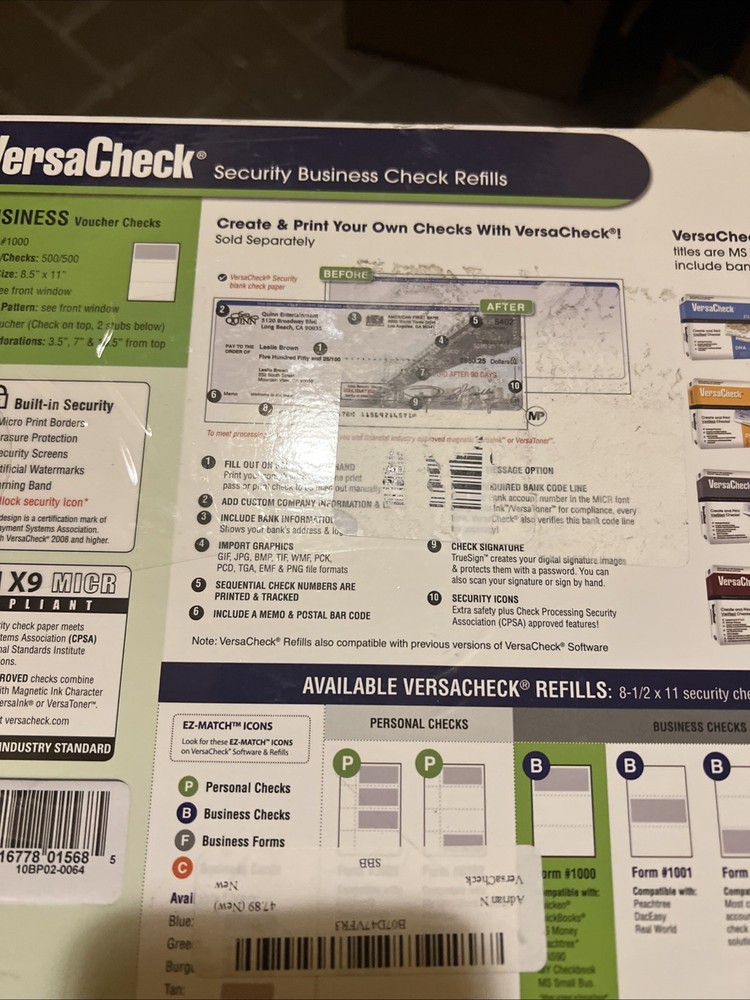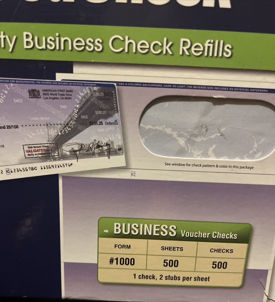 The VersaCheck Security Business Check Refills Form #1000 Vouchers consist of 500 blue checks designed for businesses. These security checks are from the trusted brand VersaCheck and come in a convenient 500-sheet pack. With a model number of 10BC02-6622, these checks are perfect for office use and are not a custom bundle or modified item. Keep your business documents secure with these reliable and efficient check refills.