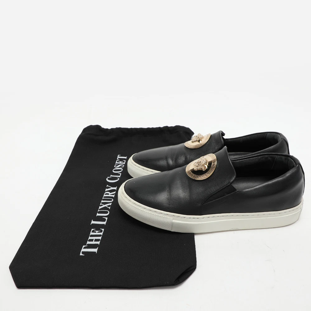 Give your outfit a chic update with this pair of designer sneakers. The creation is sewn perfectly to help you make a statement in them for a long time.Certified by The Luxury Closet - This item has gone through a detailed authentication process overseen by our experts. We offer a lifetime guarantee of authenticity on all our items. Import duties, taxes and charges are not included in the item price. These charges are the buyers responsibility. Please check with your country’s customs office to determine what these additional cost will be prior to buying. Our eBay Store About Us Contact Us Add to Favorite Sellers Versace Black Leather Medusa Slip On Sneakers Size 37 $214.5 Give your outfit a chic update with this pair of designer sneakers. The creation is sewn perfectly to help you make a statement in them for a long time. Product Details Brand Color Black Dimensions Material Leather Size 37 Outsole Width 9 cm Outsole Length 27 cm Heel Height Includes The Luxury Closet Packaging Certified by The Luxury Closet This item has gone through a detailed authentication process overseen by our experts. We offer a lifetime guarantee of authenticity on all our items. How We Check The in-house team of experts at The Luxury Closet is highly trained to verify the authenticity and the condition of the luxury products. They ensure that only 100% authentic items are put on sale.The evaluation process is unique with its own mix of assessment criteria and differs according to the category. Each item is evaluated based on the following combination of hallmarks, hardware, stitching, symmetry, material, craftsmanship, stamping, codes, hologram stickers, and packaging. Our authenticators also check if the items have been modified or amended (e.g., aftermarket diamonds, replaced batteries, repaired bags, etc.) International Buyers Import duties, taxes and charges are not included in the item price. These charges are the buyers responsibility. Please check with your country’s customs office to determine what these additional cost will be prior to buying.