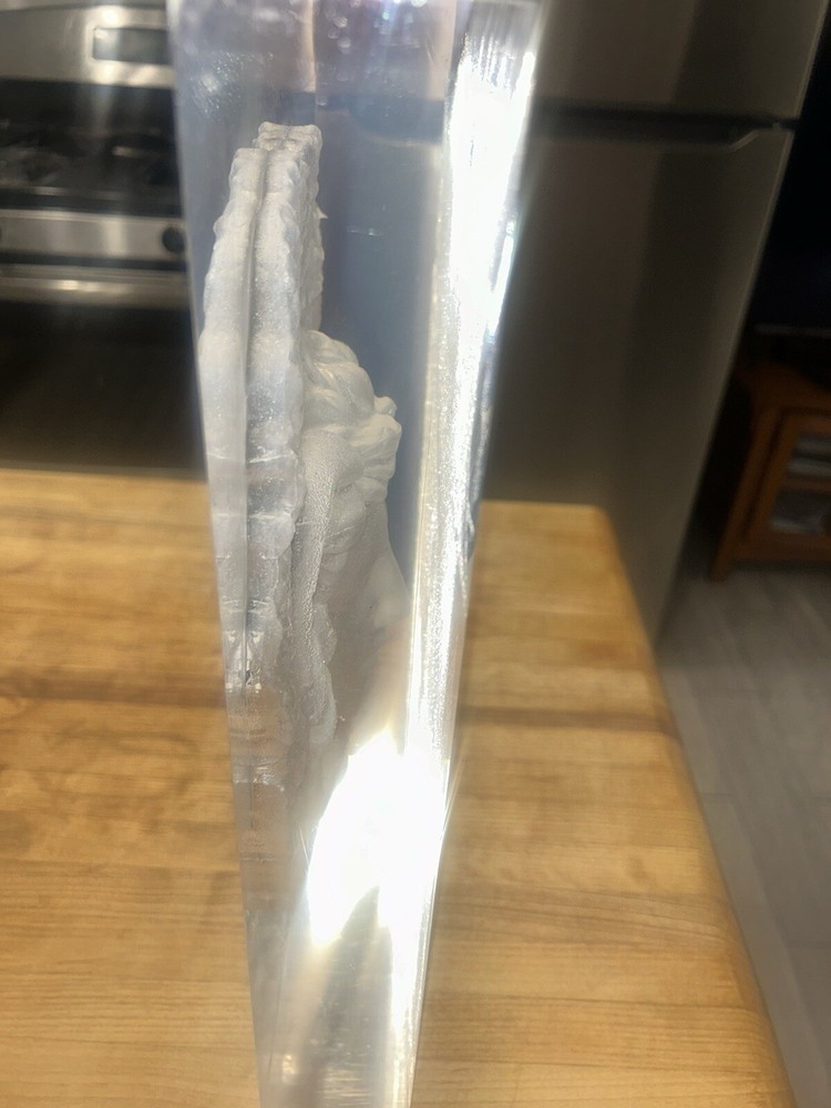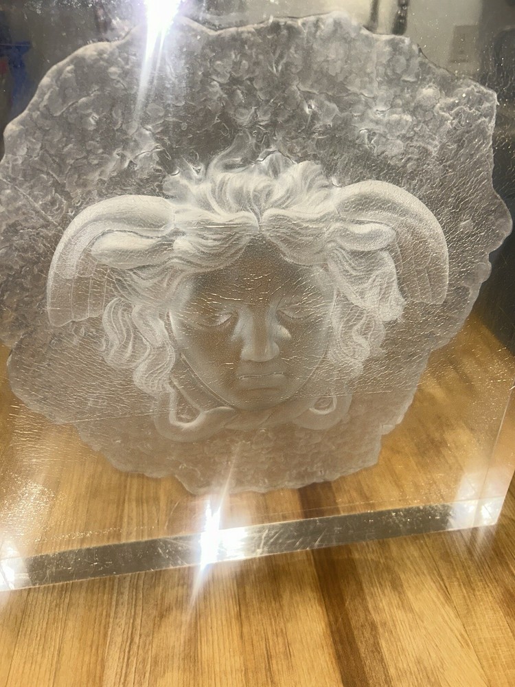 The "Versace Acrylic Medusa Sculpture" is a medium-sized bust statue of a woman in an Art Deco style, made from acrylic material using 3D modeling production technique. The sculpture features a design inspired by Greek culture, particularly the mythological figure of Medusa, with a modern twist by Versace. It is an original piece created in the 2000s and is meant to be displayed on a table as a decorative art piece.