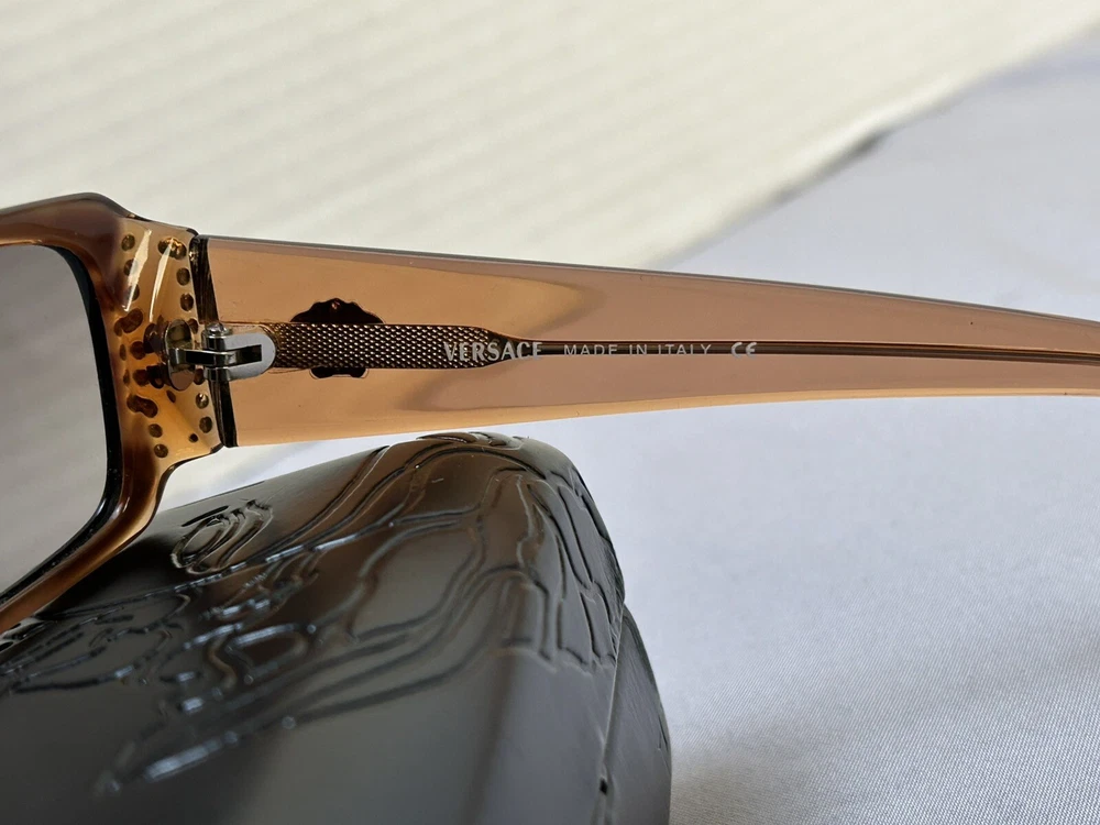 Versace VE 4041B Sunglasses Color: Black w/ Caramel Designer Case and Lens Wipe Included. Pre-owned w/ some ware. One rhinestone missing on one side. Case has some scuffs. Lenses and frame aside from rhinestone is in good condition, no scratches on lenses. Please let me know if you’d like any additional pictures.
