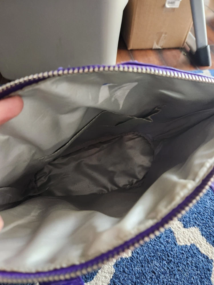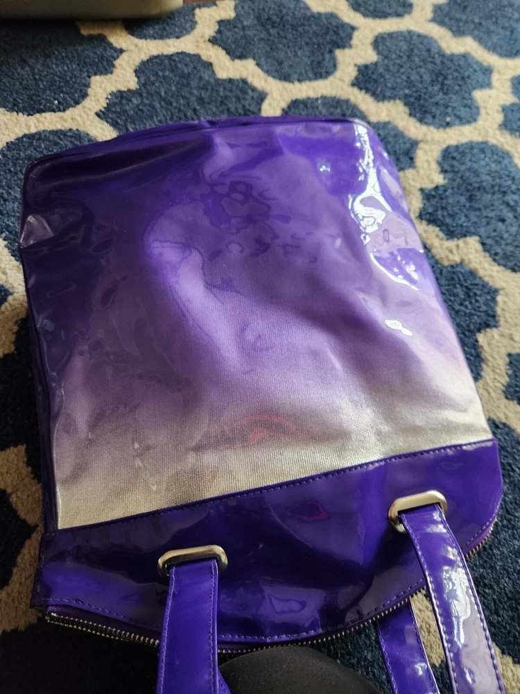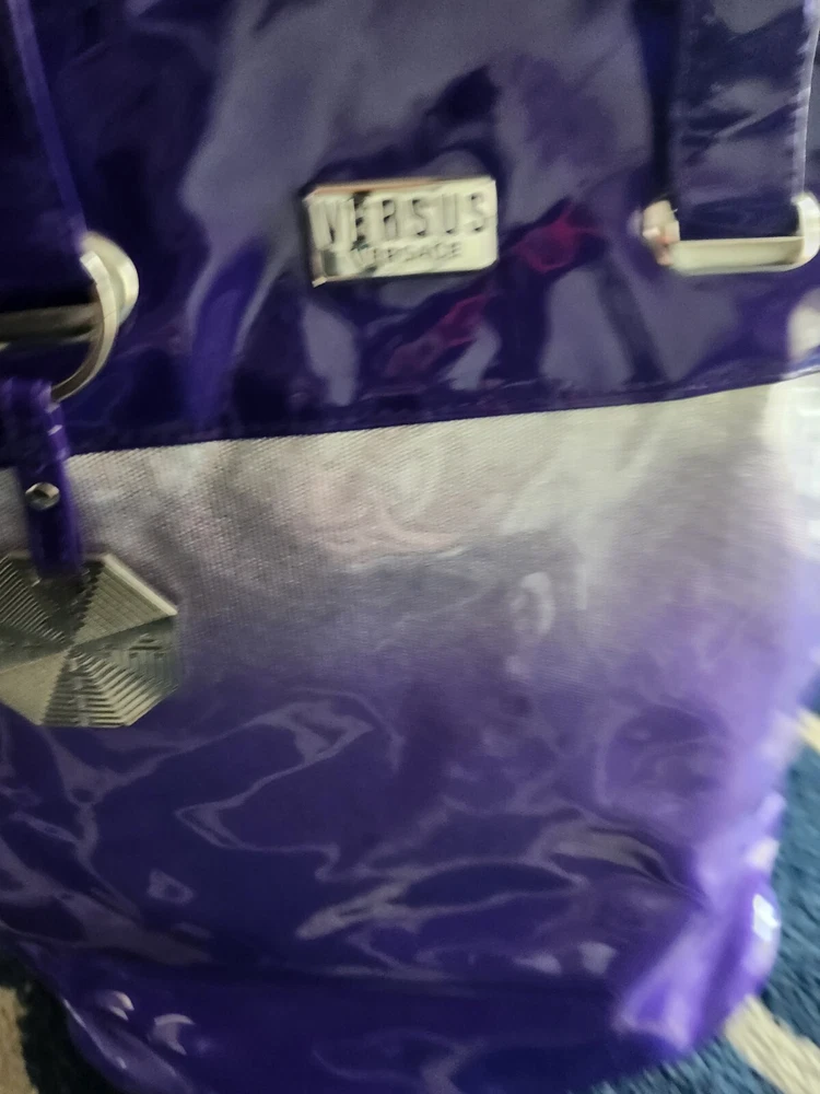 Brand: Versace Exterior Material: Nylon Style: Tote Model: Versace Versus Hardware Color: Purple Handle/Strap Color: Purple Lining Color: Purple Bag Height: 14 in Bag Width: 12 in Department: Women Exterior Color: Silver