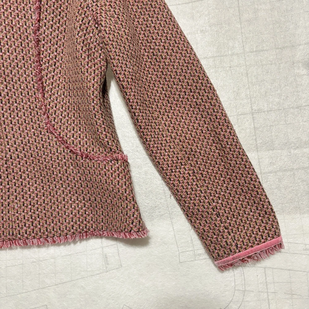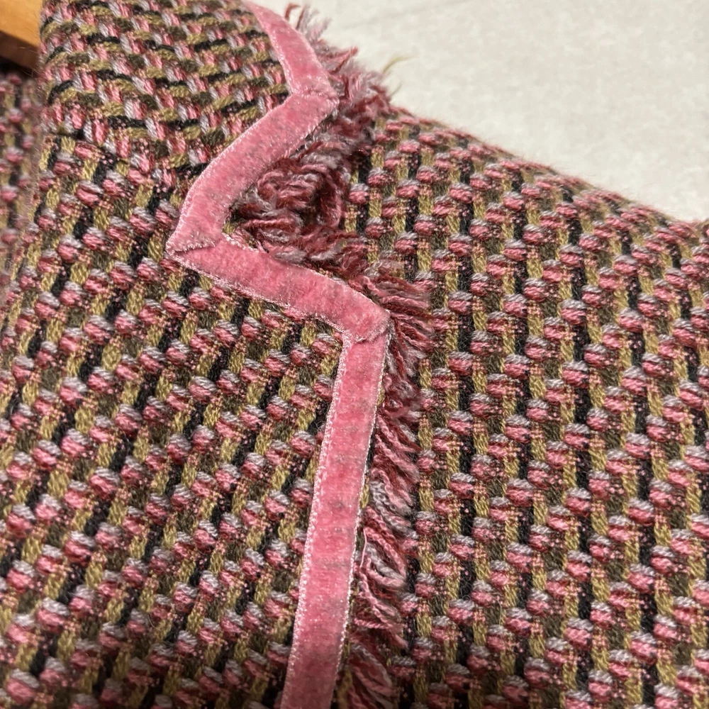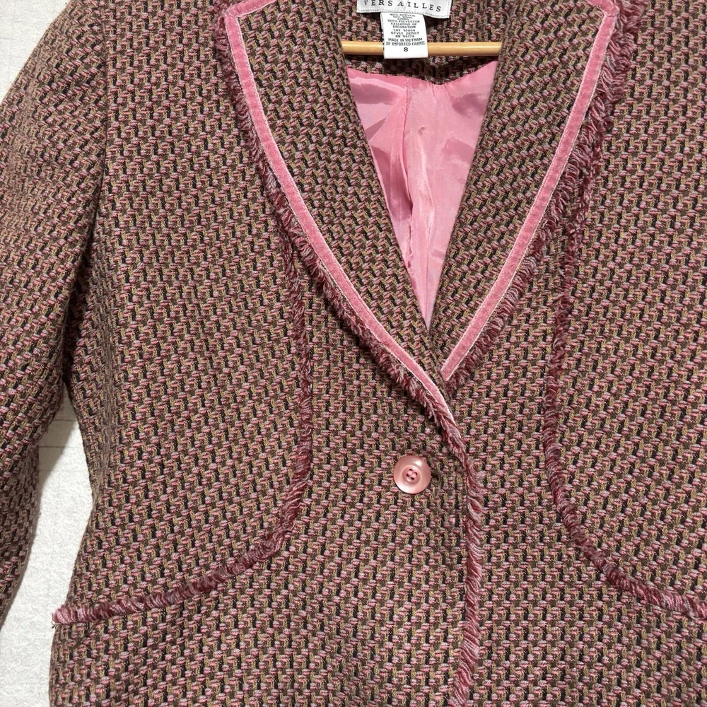 Versailles Women’s SZ 8 Pink Acrylic Wool Blend Tweed Fringed Blazer Padded. Condition is Pre-owned. Shipped with USPS Ground Advantage.