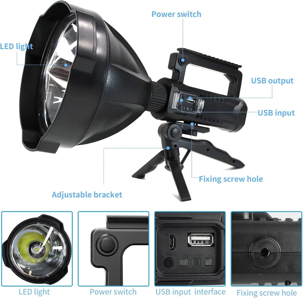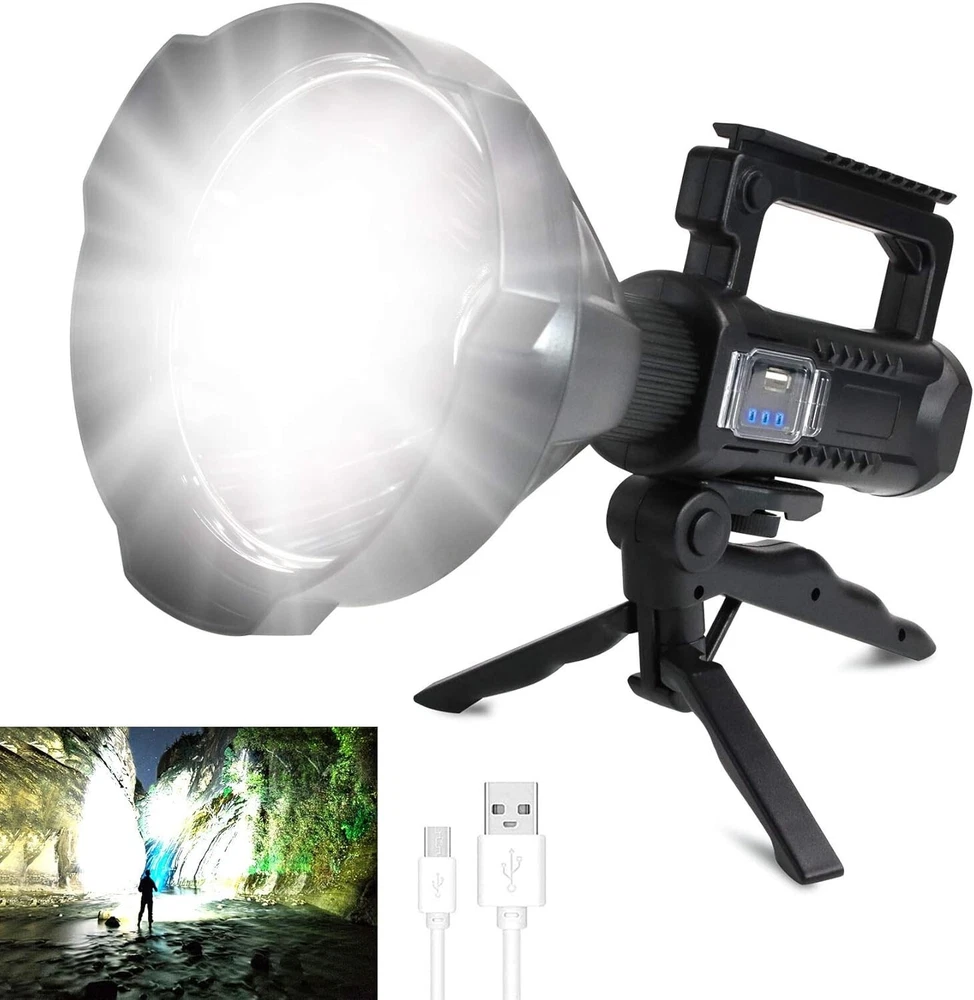 Power Source: Battery Batteries: 1 Product Specific Batteries Required. Product Dimensions: 2"d X 2"w X 2"h Material: ABS, Aluminum Lighting Technology: LED Battery Description: Build In Battery Style: Modern Mounting Type: Tripod Finish Type: Aluminum Light Path Distance: 3280 Feet Brightness: 120000 Lumen Type: Flashlight Number of Batteries: 1 Finish Types: Aluminum Number of Lights: 1-3 Voltage: 110 volts (ac) Item Weight: 2.1 pounds Lumens: 120000 gtin13: Does Not Apply White Brightness: 120000 Lumens Brand: Unbranded Light Source Type: Led Personalize: No Operating Range: 1000 m Operating Time: 5-10 Hours Battery Cell Composition: Lithium Item Package Quantity: 1 Number of LEDs: Not specified Water Resistance Level: Waterproof Color: Black Battery Technology: Lithium Size: Xl-large Included Components: Batteries Included UPC: Does Not Apply Runtime: 10 Hours Features: Rechargeable, Batteries Included, IPX5 Waterproof, 4 Light Modes, USB Rechargeable, Power Display, Adjustable Tripod, Lightweight, Impact Resistant, Drop Resistant, Durable