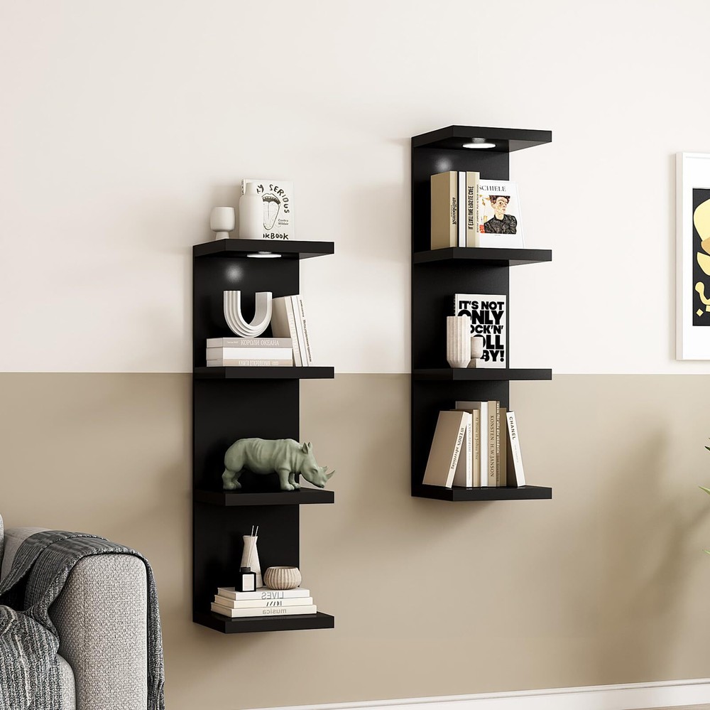 FLOATING LACK WALL SHELF — Versatile 4-tier wall Shelf Unit in a crisp and timeless black finish—the perfect addition to elevate your home decor. Display charming showpieces, decorative items, and other prized possessions while offering functional storage with square-shaped display shelves — Enhance décor and fill in empty wall space above a desk, fireplace, entryway, vanity, child bedroom, between windows, and so much more. DECORATE & DISPLAY FLOATING SHELVES WITH LIGHT—One of the standout features of this wall shelf unit is the integrated LED remote control light. Illuminate your display with lighting, setting the mood and enhancing the visual impact of your showcased items. The LED light adds a contemporary and ambient glow, creating a focal point that draws attention to your carefully curated collection. SAVING SPACE — Whether you choose to install it in your living room, bedroom, or office, this Lack Wall Shelf is sure to become a functional and aesthetic focal point. Floating solid square shelves take up zero square feet ; Saving space with a creative way to reduce clutter and highlight décor in a small or large area; Give the illusion of a larger space in your studio apartment, dorm, or small living quarter, VERSATILE USAGE FLOATING SHELF-Beyond its functionality, this wall shelf unit is not just limited to a display shelf. Explore amazing vanity designs, discover the latest makeup vanity ideas, or incorporate it into a mirror vanity collection. It's also an excellent addition to boys' Lego-themed bedrooms, adding both practical storage and a touch of modern design. EASY TO INSTALL — Made of beautiful faux wood with a smooth matte finish — Attaches firmly to the wall without visible support — Minor assembly required — Mounting Hardware INCLUDED — Wipe clean with a dry cloth — Measures approximately 9.25" X9.84"x37.8"
