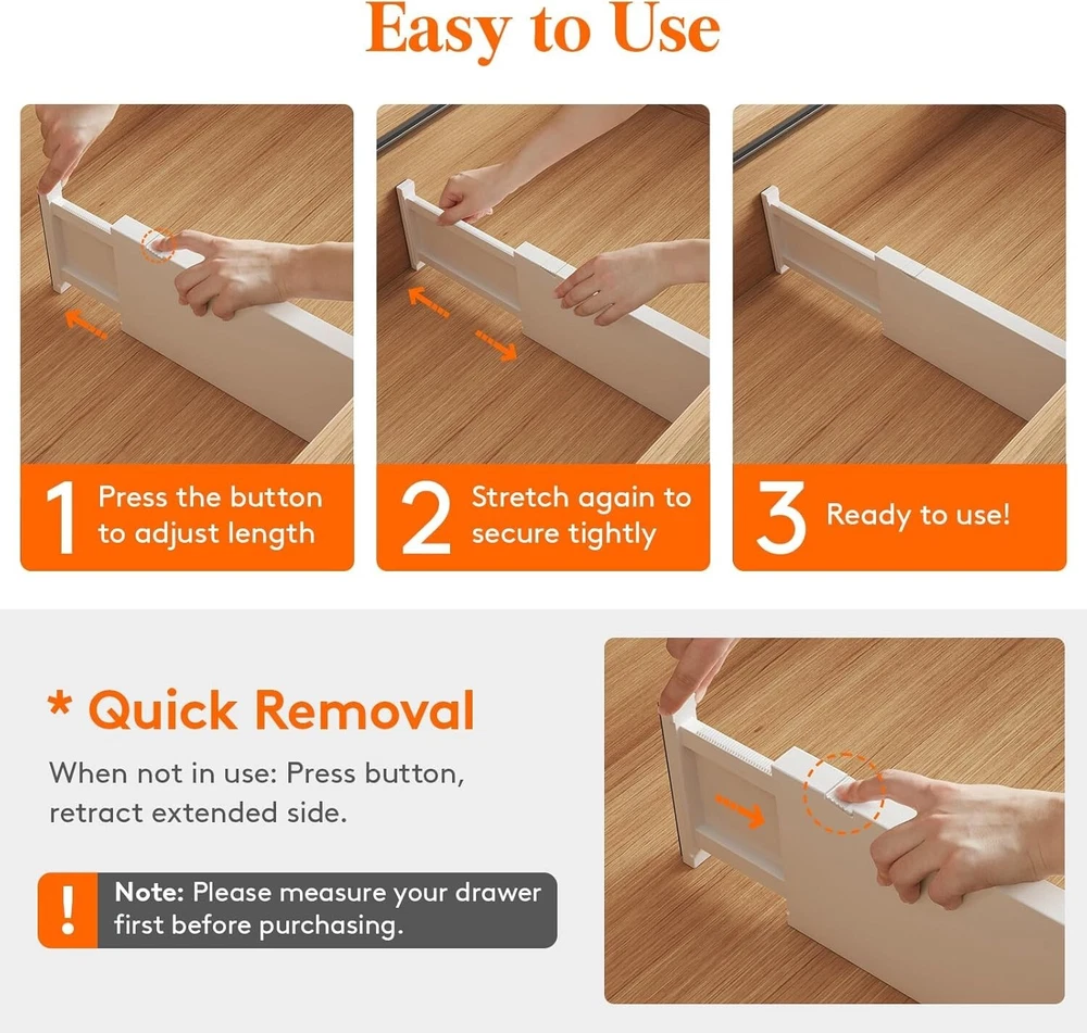 Versatile 5 Pack Drawer Organizers - Adjustable for Clothes, Kitchen, and Office ‹ › ‹ › ‹ › ‹ › ‹ › ‹ › ‹ › ‹ › ‹ › ‹ › Versatile 5 Pack Drawer Organizers - Adjustable for Clothes, Kitchen, and Office Features: Expandable & Adjustable: Our drawer dividers easily fit into most drawers and cabinets, measuring 0.8" in width, 5" in height, and adjustable in length from 13.5" to 22". Easy to Use: Adjust the length with the top button for a secure fit, providing strong spring tension that keeps the drawer organizers upright. Advanced Design: Made from stable ABS material with high-quality EVA foam sponges at the ends to prevent scratches and damage, leaving no trace or residue. Multipurpose: Perfect for any drawer in your home or office, ideal for organizing clothes, kitchen utensils, office supplies, makeup, and bathroom clutter. Customizable Placement: Available in sets of 5 or 8, arrange them vertically or horizontally to suit your organizing needs. Benefits: Transform chaotic drawers into organized spaces. Accommodate a variety of items, making it simple to find what you need. Durable and reliable materials ensure long-lasting use. Easy installation and retraction mean no fuss for you! Customizable to fit your unique storage needs for ultimate flexibility. Why choose our Versatile 5 Pack Drawer Organizers? Are you overwhelmed by cluttered drawers filled with miscellaneous items? Our Versatile Drawer Organizers are here to save the day! With adjustable lengths and a patented design, these storage solutions offer a tailored organizing experience. Made with high-quality materials that protect your drawer interiors, they ensure that your belongings remain in tip-top shape while providing maximum functionality. Transform your spaces into the epitome of organization and ease—order your set of Versatile Drawer Organizers today! Shipping Free & Fast Shipping - We offer free shipping to most of the USA with a normal delivery time of 3-7 days. However, due to the current situation, additional delivery time (up to 3 weeks) may be required for some items. Alternative Carriers - We may use alternative carriers (e.g. USPS, FedEx, UPS, etc.) to ensure your package arrives safely and on time. Due to the use of multiple carriers, we are unable to provide a tracking number automatically. Handling Time - Orders are processed and shipped within 1-2 business days of receiving cleared payment. Shipping Restrictions - Shipping to Alaska, Hawaii, Puerto Rico, Guam, and other US territories may incur shipping charges or delivery restrictions. Please contact us before ordering, or your order can be refunded/cancelled. State Restrictions - There may be restrictions based on your state of purchase. For example, certain items may not be shipped to California due to state regulations. Contact for Tracking Updates - If you require tracking updates or have any concerns about the delivery of your order, please feel free to contact us, and we will be happy to assist you. Return 30-Day Hassle-Free Returns - We want you to be completely satisfied with your purchase. If you are not, you can return the item within 30 days of receiving it for a full refund or exchange. Easy Return Process - To start a return, simply contact us and we will provide you with a prepaid return shipping label and detailed instructions. Restocking Fee - There are no restocking fees for returns. However, the buyer is responsible for return shipping costs if the return is not due to a seller's error. Refund Processing Time - Refunds will be processed within 5 business days of receiving the returned item in its original condition. Payment We accept all major credit cards, PayPal, and Apple Pay for your convenience. Your payment information is secure and encrypted to ensure a safe and seamless transaction. Please complete your payment within 3 days of purchase to avoid any delays in shipping. Feedback Your feedback is extremely important to us. We strive to provide the best products and customer service possible. If you are satisfied with your purchase, please take a moment to leave us a positive review. If you have any concerns or issues with your order, please contact us before leaving negative feedback. We are committed to resolving any problems and ensuring your satisfaction. Contact Us If you have any questions or concerns, please feel free to reach out to our customer support team. You can contact us through the eBay messaging system. We are available Monday to Friday, 9:00 am to 5:00 pm EST, and we will do our best to respond to your inquiry within 24 hours. Buy it now and enjoy a pleasant shopping experience! UPC: Not Set Unit Quantity: 5.0 Material: Plastic,ABS,EVA foam Mounting: Free Standing Features: Adjustable,Expandable Care Instructions: Clean with Damp Cloth Brand: Unbranded Item Height: Drawer Dividers Item Length: Drawer Dividers Item Width: Drawer Dividers Type: Drawer Organizer Number of Shelves: 1 Item Depth: 13.5 in Item Weight: 3.68 lb MPN: Not Set Model: Not Set Number of Items in Set: Five-Piece Color: White Number in Pack: 5 Number of Compartments: 5 Finish: Glossy Style: Modern Country/Region of Manufacture: Not Set Pattern: Not Set Original/Reproduction: Not Set Unit Type: Unit Assembly Required: Not Set